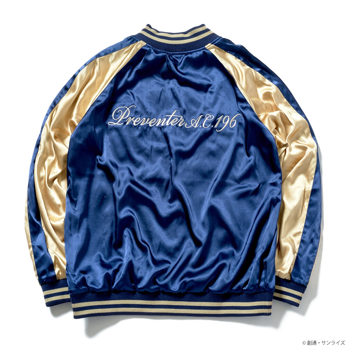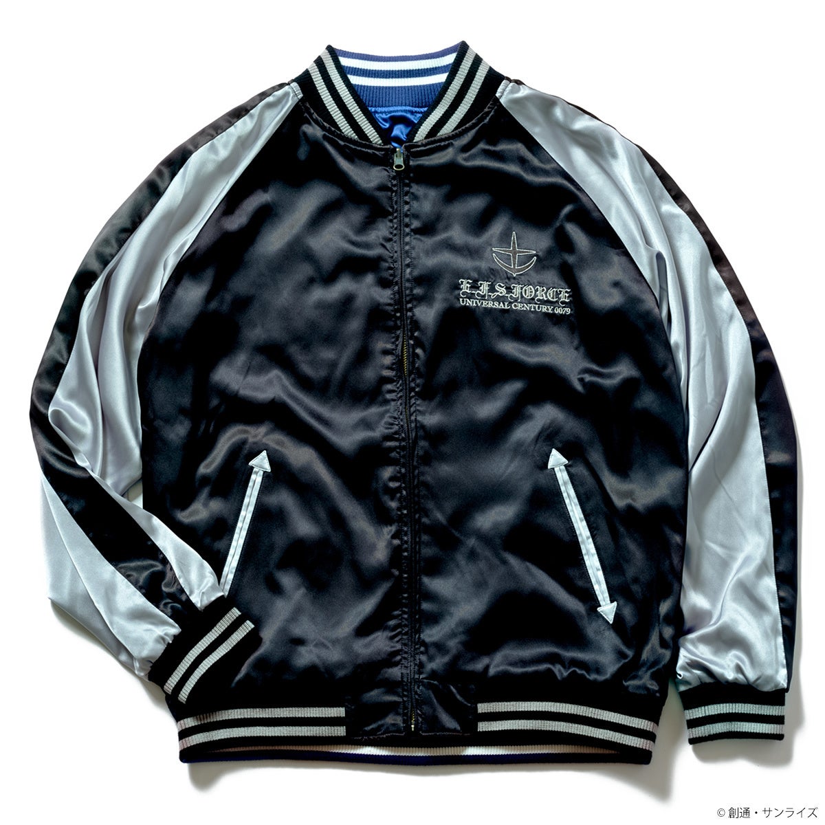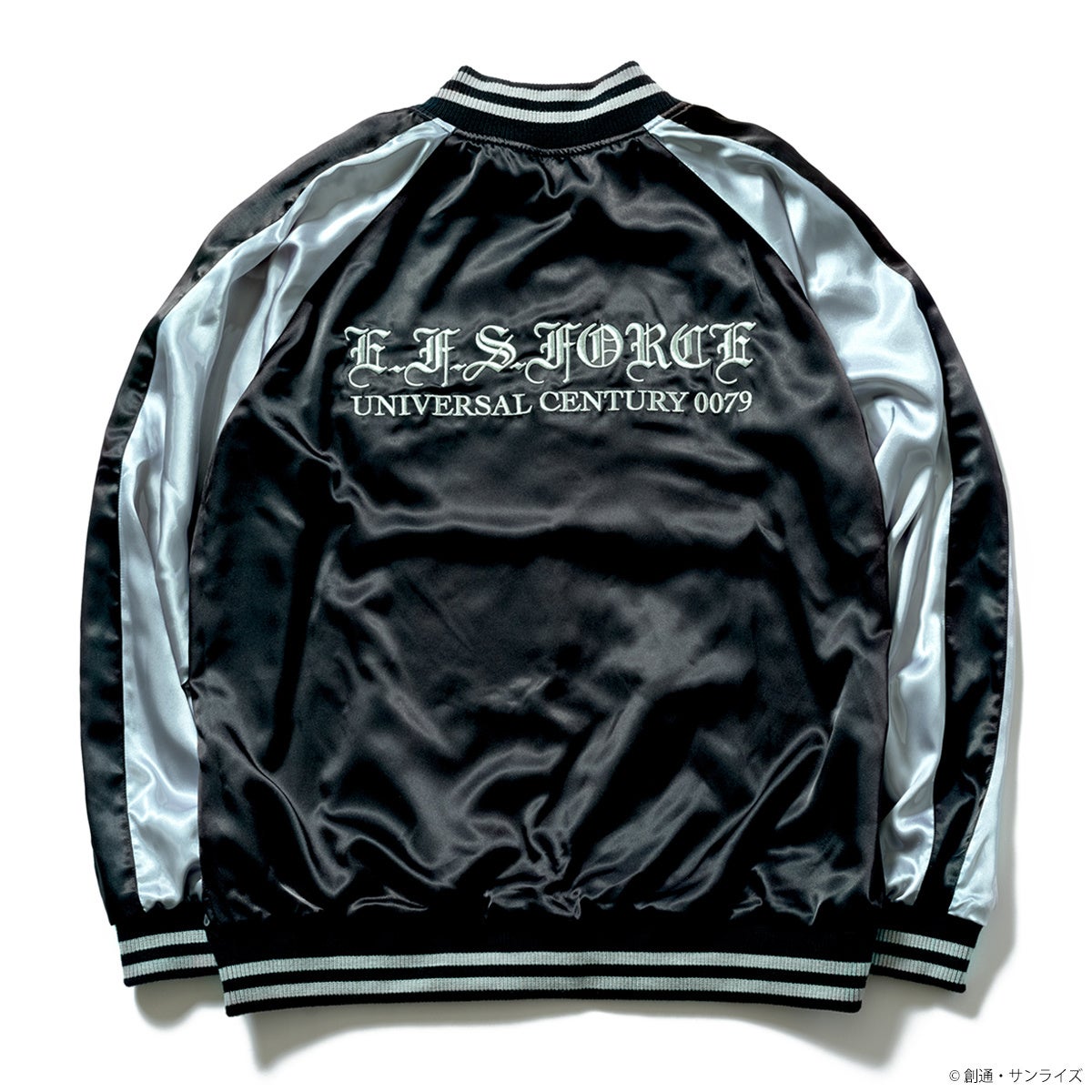 『機動戦士ガンダム』 より、JAPANモチーフのスカジャンが登場!本商品は、光沢がありさらっとしたサテン地に、和柄タッチのダイナミックなイラストを繊細な刺繍で表現したリバーシブル仕様のスカジャンです。ガンダムモデルは、表面ネイビー×ホワイトの配色で、フロント左右に鶴と地球連邦軍のマークを刺繍、背中に鶴と富士山、ガンダムを組み合わせた和柄テイストのデザイン、又、リバーシブルになる裏面はブラック×シルバーの配色で、背中にロッカーテイストのE.F.S.FORCEロゴを刺繍。身頃には両面仕様のダブルジップを使用しており、どちらの面で着用する際にもニュアンスを付けたスタイリングをお楽しみいただけます。