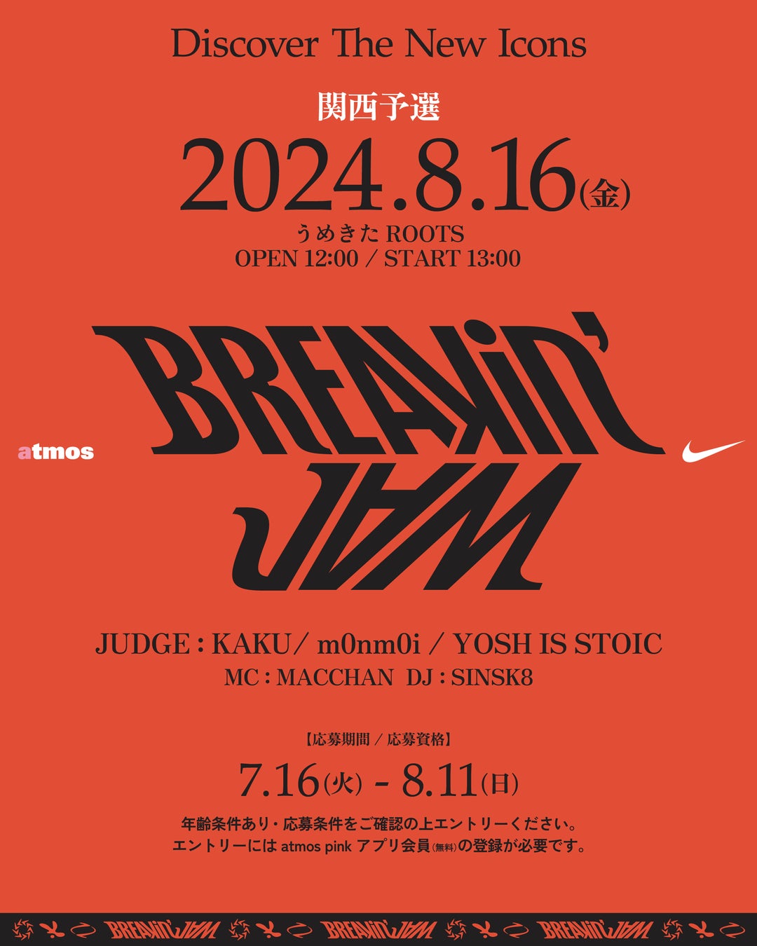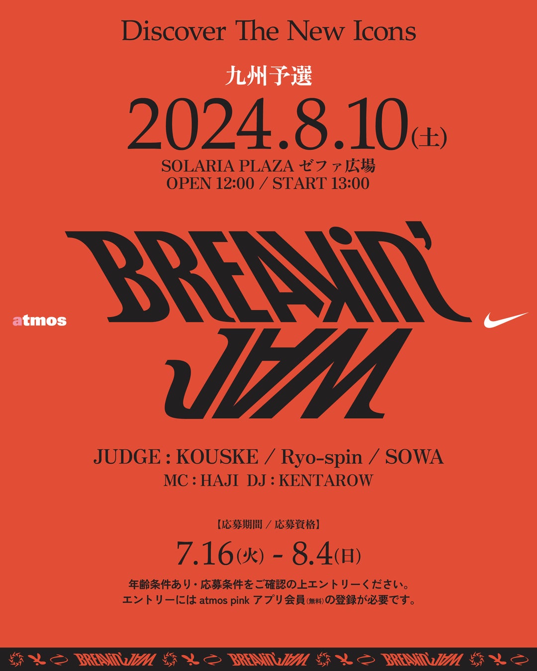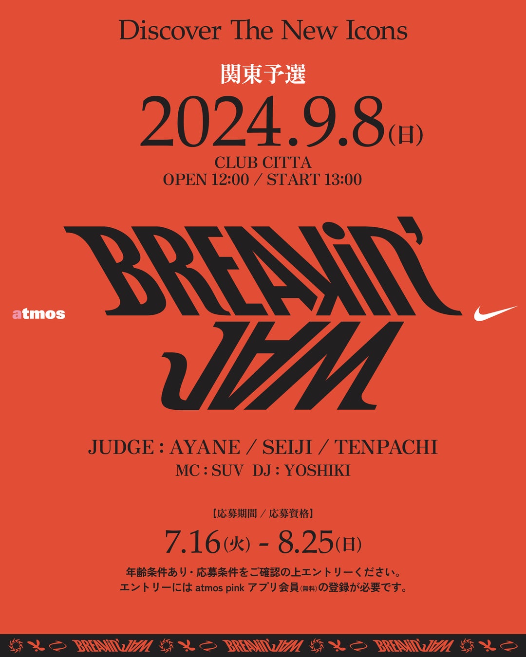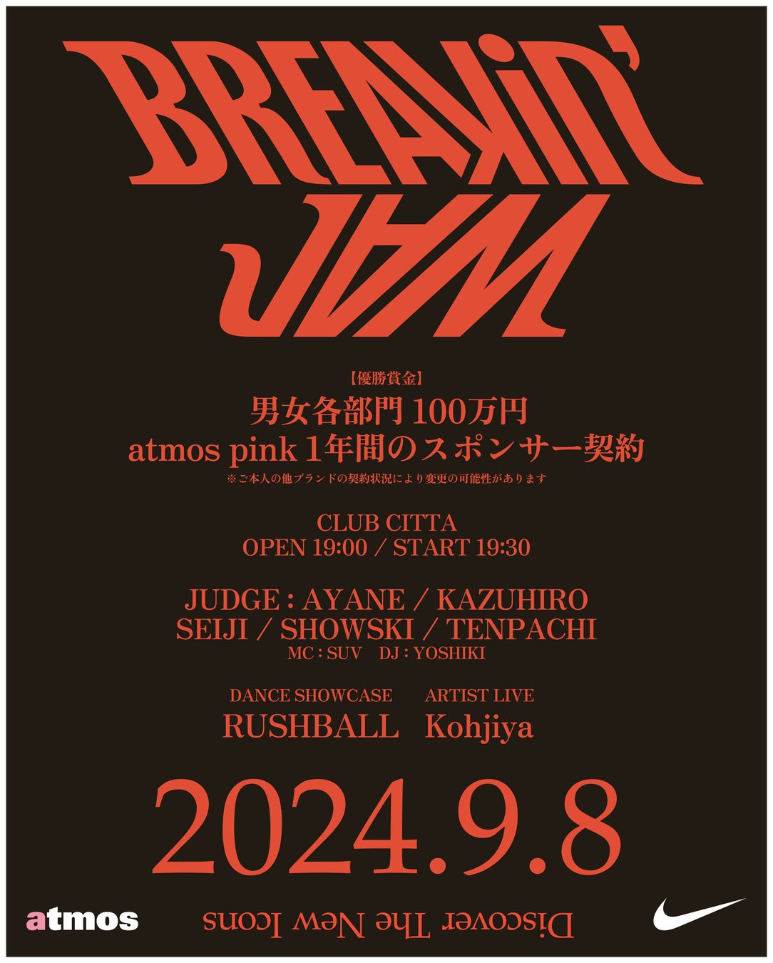 本大会BREAKIN‘ JAMは、atmos pink初のブレイキンバトルであり、日本のブレイキン界で新たなアイコンを発掘し育成することを目的としています。九州、関西、関東の3会場で予選を行い、ファイナルでは男女各1名の優勝者に賞金100万円と1年間のスポンサー契約(予定)が授与されます。