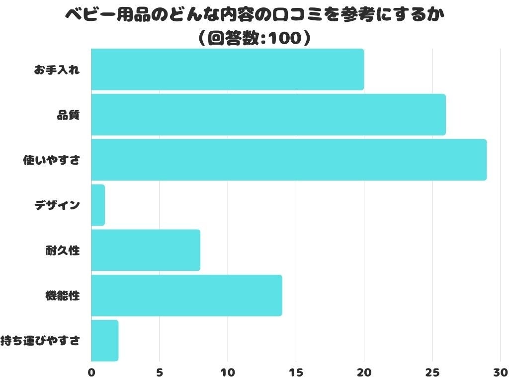 ベビー用品のどんな内容の口コミを参考にするかをアンケートにて調査したところ、1位は「使いやすさ」でした。