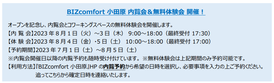『BIZcomfort小田原』は、NTTグループ所有ビルを『BIZcomfort』に生まれ変わらせるコンバージョン企画の第一弾として、初めての取り組みになります。第二弾は「NTT厚木ビル」に、2023年9月1日(金)『BIZcomfort本厚木』をオープンする予定です。