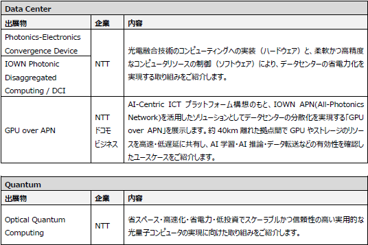 ” AI-Resilient Infrastructure with Photonics”のゾーンでは、光電融合技術でデータセンターなどの低消費電力化を実現するIOWNの最新の取り組みや、省スペース・高速化・省電力・低投資で大規模計算が可能な光量子コンピュータなど、AI活用の拡大などに対応できる持続可能なインフラの取り組みを出展いたします。