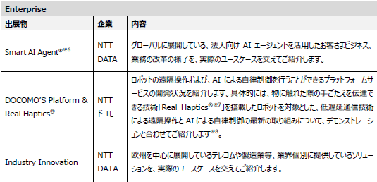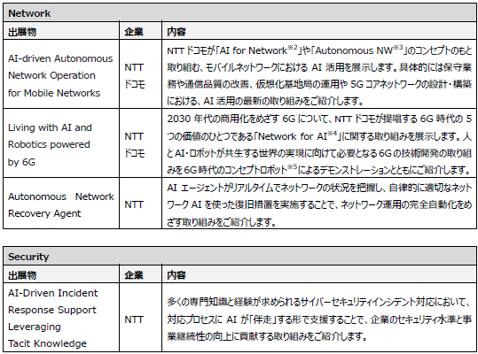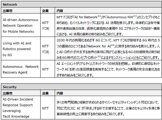 加えて、人とAI・ロボットが共生する世界を見据えた「Network for AI」(※2)など、6G実用化に向けたモバイルネットワークなど、デジタルインフラにおけるAI活用の取り組みも出展いたします。