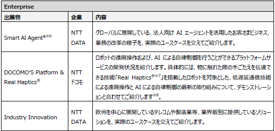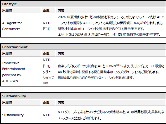 “AI-Powered Services and Solutions”のゾーンでは、NTT DATAを中心にグローバルに展開しているAgentic AIや、ロボットの遠隔操作および、フィジカルAIによる自律制御が可能な現在開発中のプラットフォームサービスなど、企業活動の在り方や産業を変革する取り組みについて出展いたします。また、個人のお客さま向けの取り組みとして、NTTドコモの新たな個人向けAIエージェントや、AI活用により没入感のあるエンターテインメント体験を可能とする現在開発中のソリューションを出展いたします。