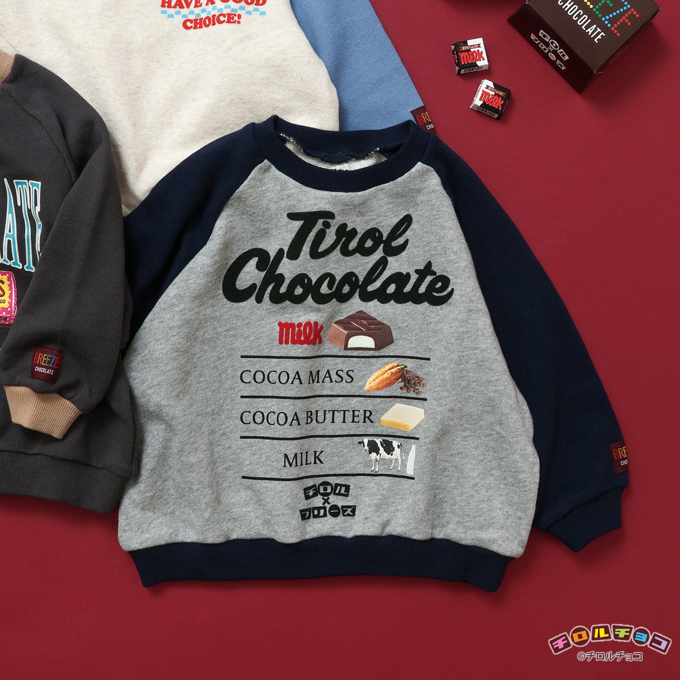チロルチョコのデザインや、カカオ等の原材料をプリントしたトレーナーはBABYとのリンクコーデも可能。袖には今回のコラボレーションのオリジナルネームが付いています。