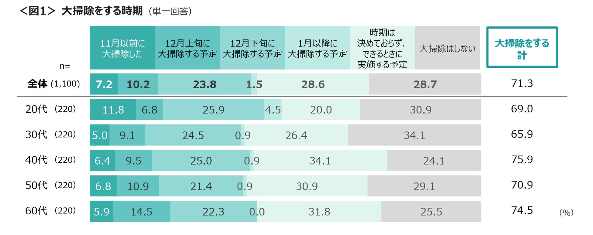 大掃除の時期が決まっている場合「12月下旬」と「12月上旬」と合わせて12月中に行う人は34.0%とボリュームゾーン。時期が決まっていない人は28.6%。20~30代は大掃除をしない人が多い。<図1>