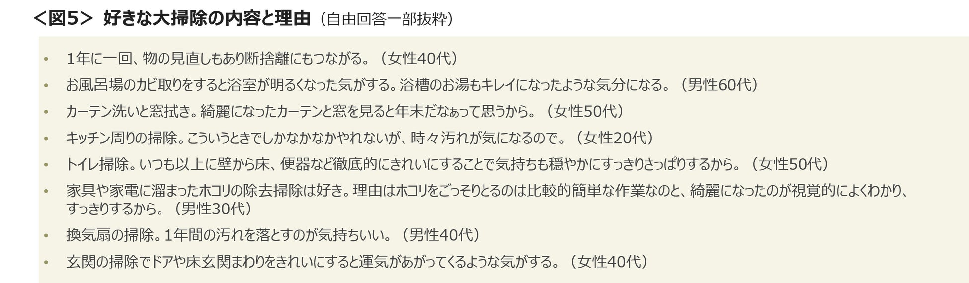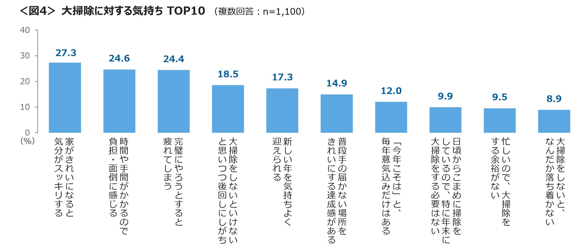 「家がきれいになると気分がスッキリする」「時間や手間がかかるので負担・面倒に感じる」「完璧にやろうとすると疲れてしまう」と大掃除に対する気持ちはポジティブとネガティブの双方が高い。<図4>