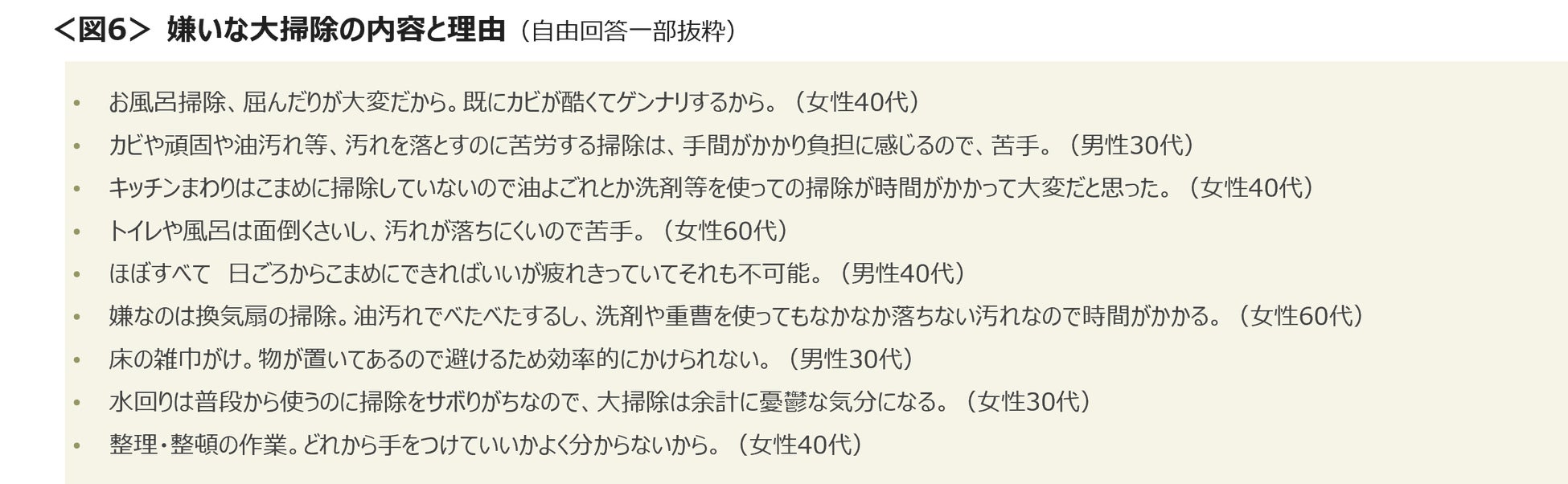 好きな掃除は「お風呂のカビ取り」や「換気扇掃除」など。嫌いな掃除は「カビや頑固な油汚れ」「お風呂・トイレ」などで、キッチン周りと水回りが多い。掃除の後はきれいにすることで気持ちが「穏やかになる」「さっぱりする」の声があがった。<図5・図6>