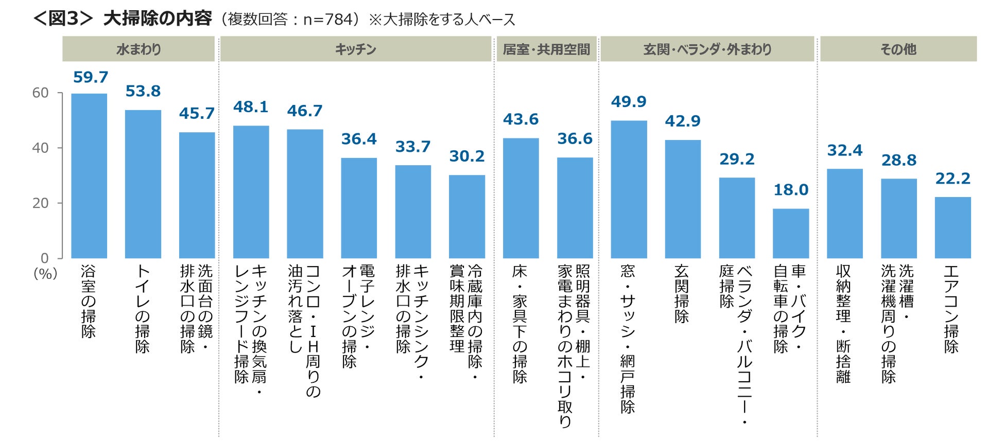 掃除内容は「浴室」「トイレ」「窓・サッシ・網戸」「キッチンの換気扇・レンジフード」「コンロ・IH周りの油汚れ落とし」が上位。<図3>