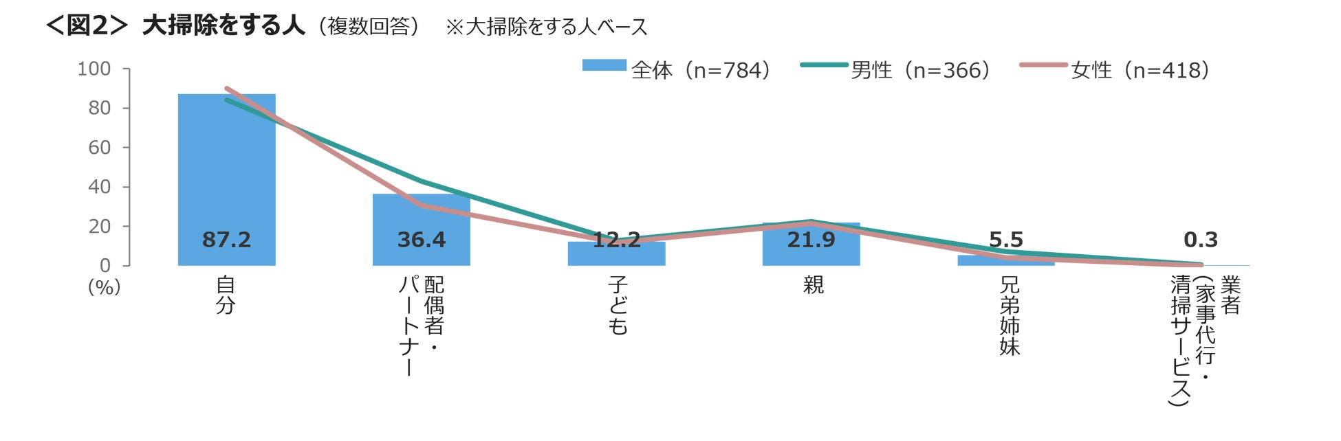 大掃除の担当は「自分」が87.2%、次いで差が開いて「配偶者・パートナー」36.4%。
