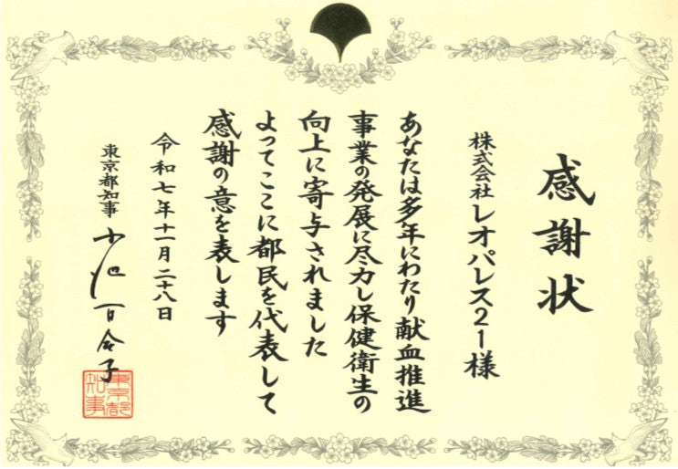 株式会社レオパレス21(東京都中野区 代表取締役社長:宮尾 文也、以下「当社」)は、2025年11月28日に東京都庁で開催された「令和7年度献血功労者 東京都知事感謝状贈呈式」において、東京都知事感謝状を授与されました。この感謝状は、当社の献血に対する理解と継続的な協力を行ってきたことに対するものです。