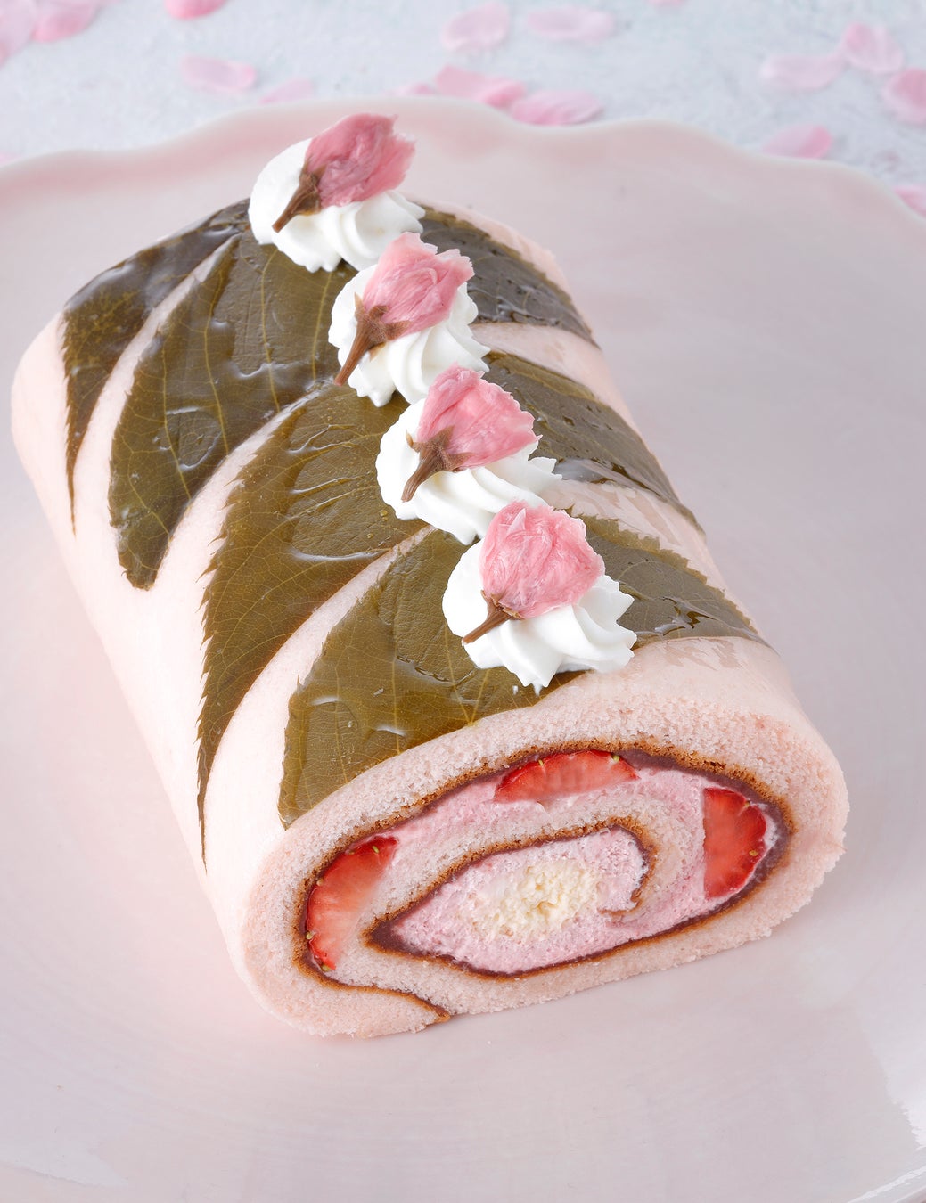 桜がふわっと香る苺クリームとさわやかなレアチーズムースを、ラズベリーの濃縮果汁でピンク色にしたスフレ生地で巻き上げました。塩漬けにした桜の花と葉がほんのり香り、隠し味にブランデーを加えたこしあんのやさしい甘みとともに春の訪れを感じる味わいに。