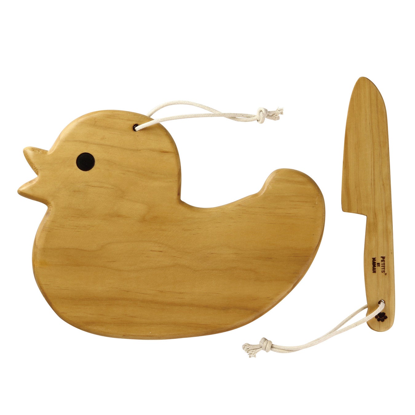 木の温もりを感じられる安心の素材でできた包丁と可愛らしいカッティングボード。子供でも扱いやすい軽量な素材のパイン材(ウレタン塗装)を採用しました。