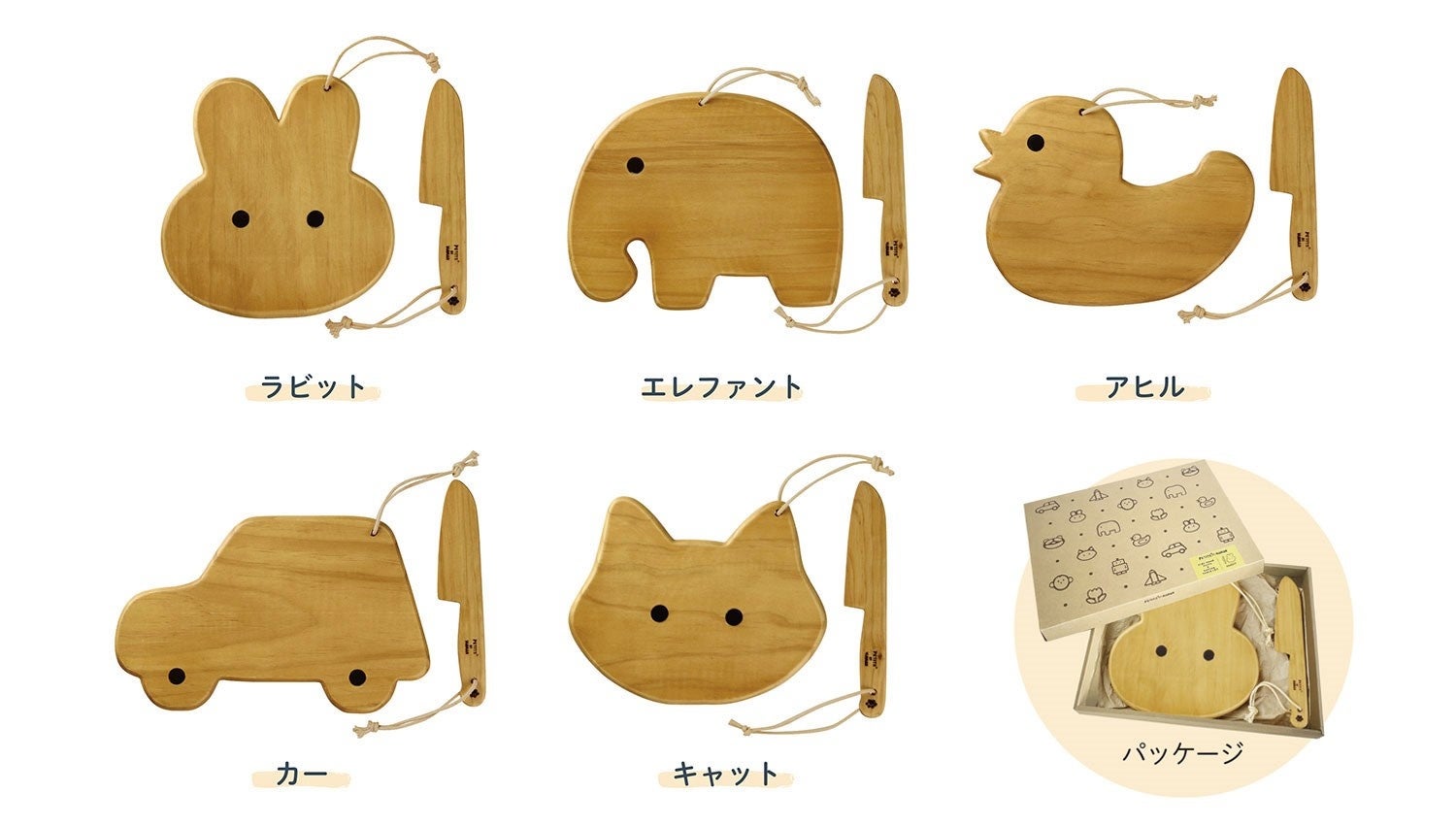サイズ:包丁:w205d38h5mm、ウサギ:w280d175h15mm、エレファント:w240d175h15mm、アヒル:w245d180h15mm、カー:w280d175h15mm、キャット:w220d180h15mm