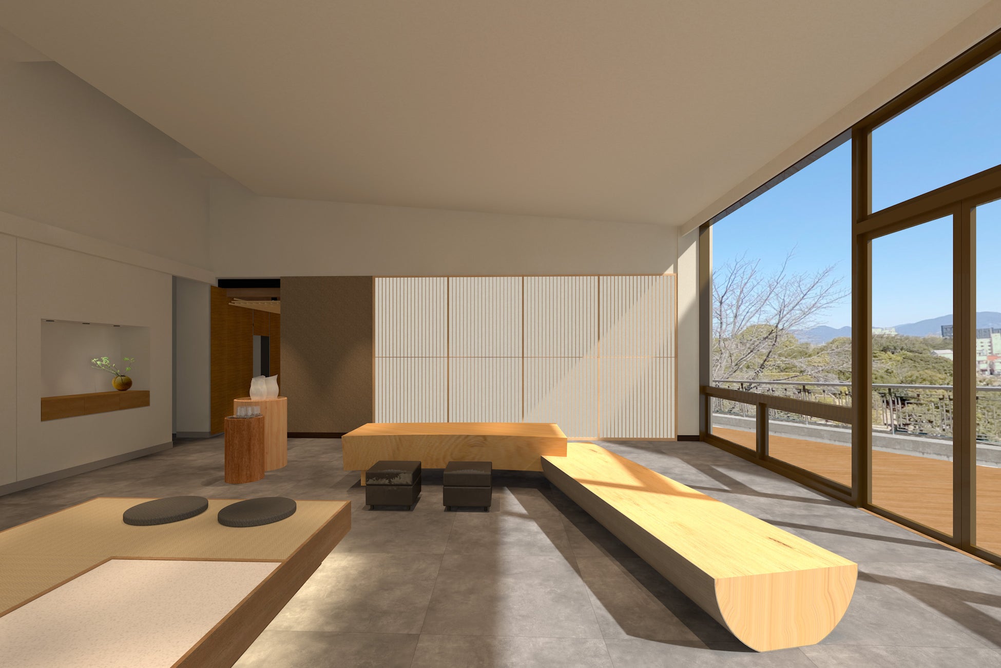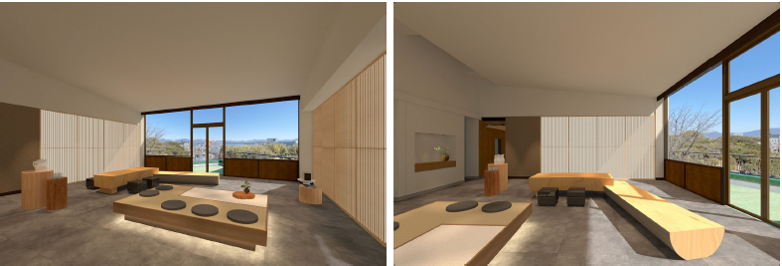 居間空間は木材で囲み、木材の温かみと癒しを感じながら自分自身と向き合うメディテーションルームを