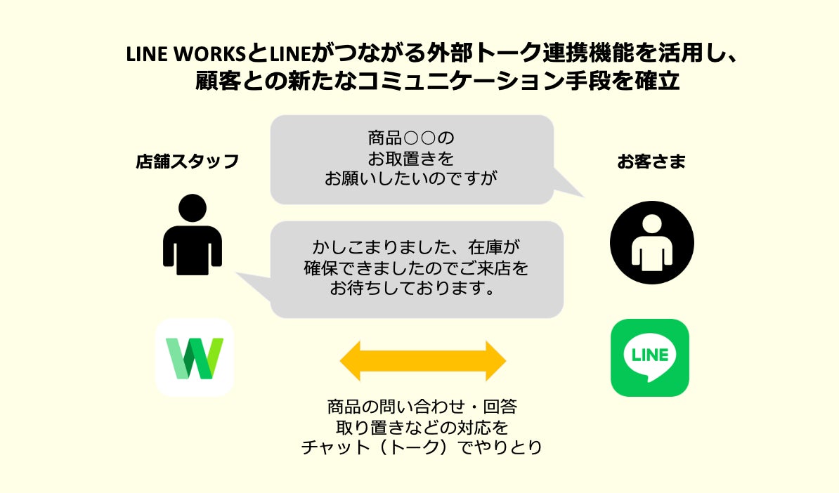 この度「LINE WORKS」を導入することで、LINEとの外部トーク連携機能を活用したお客様対応が可能になり、商品の問い合わせ・回答、取り置き商品に関する連絡などがチャット(トーク)で円滑に行えるようになりました。