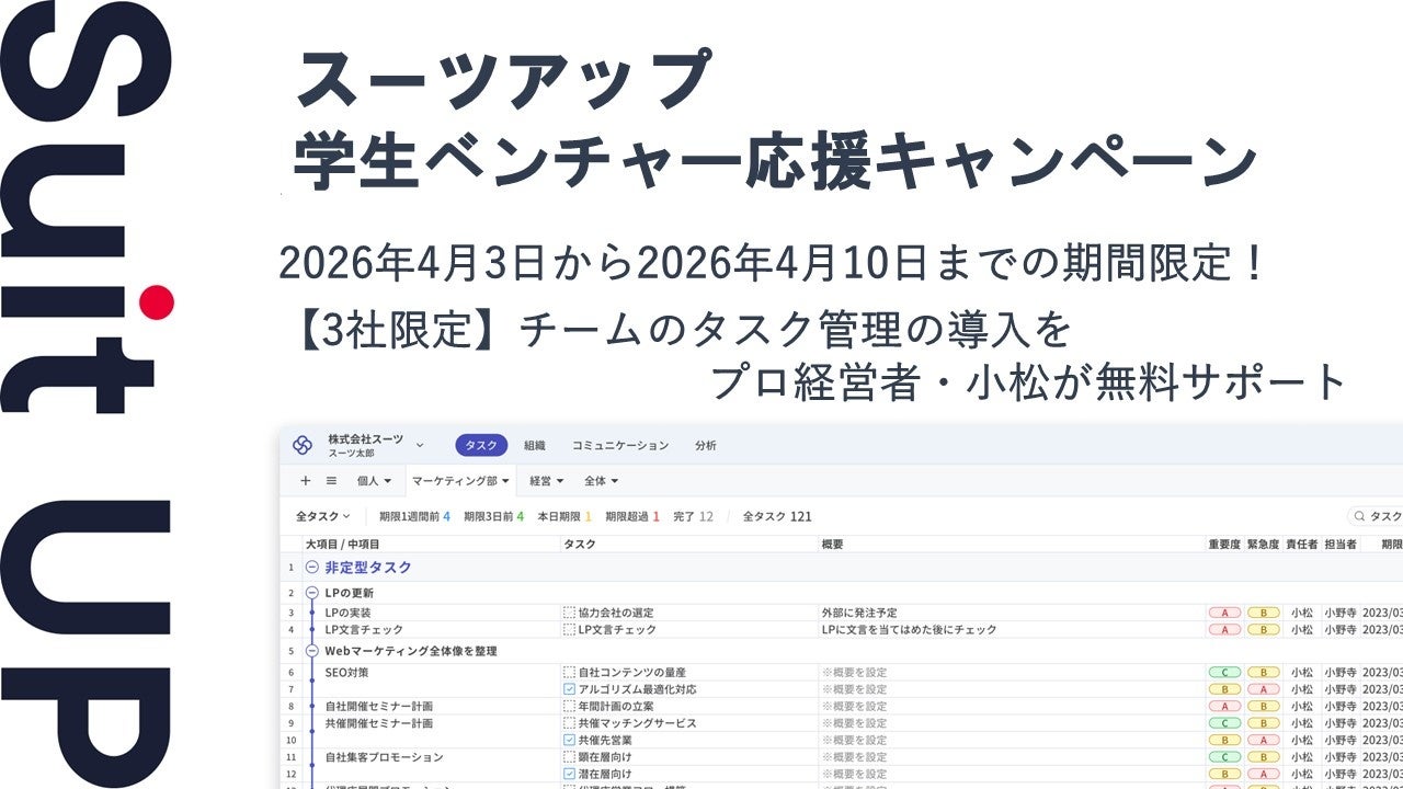 株式会社スーツ(所在地:東京都千代田区、代表取締役社長CEO:小松 裕介)は、AIタスク管理・プロジェクト管理ツール「スーツアップ」において、学生ベンチャー応援キャンペーンを実施いたします。