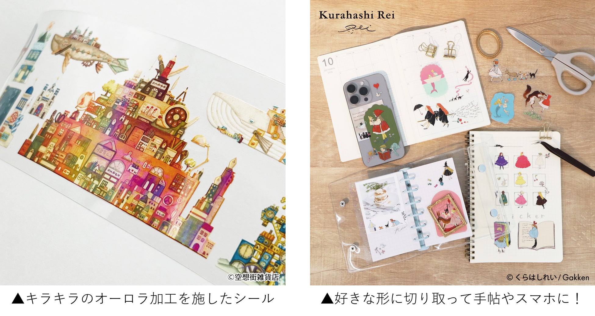 イラストをたっぷりと配置したロール型のシートシールです。シールにはキラキラとしたオーロラ加工を施し、高精細印刷によって各クリエイターの世界観をクリアに表現しています。好きな形に切り取って使うことができるので、ノートデコのパーツにも最適です。