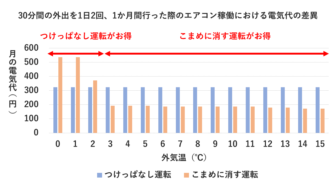 冬の暖房使用について、「つけっぱなし」と「こまめに消す」運転の電気代をパナソニック独自のアルゴリズムを用いて比較した結果、暖房使用時において、住宅の断熱性、室内熱負荷などの環境によるものの、外気温が3℃未満のような厳しい寒さの場合は、室温が大きく下がりやすく設定温度に戻すために多くのパワーが必要となるため、「つけっぱなし」運転がお得です。一方で、3℃以上であれば、室内温度がそこまで下がらないため「こまめに消す」運転の方が電気代の節約につながることが分かりました。