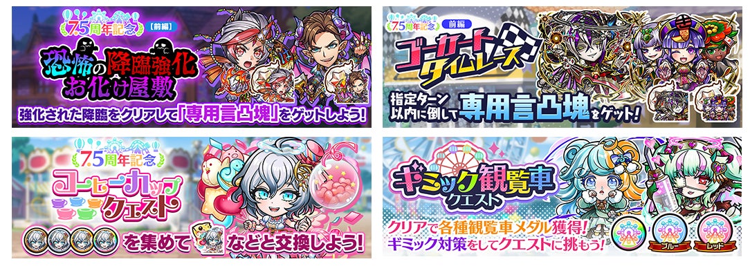 過去の降臨クエストが難易度アップした「恐怖の降臨強化お化け屋敷」や、曜日ごとにギミックが変化する「ギミック観覧車クエスト」など、遊園地のアトラクションをイメージした特別なクエストが登場します。各クエストをクリアすることで、それぞれ異なる報酬を獲得できます。