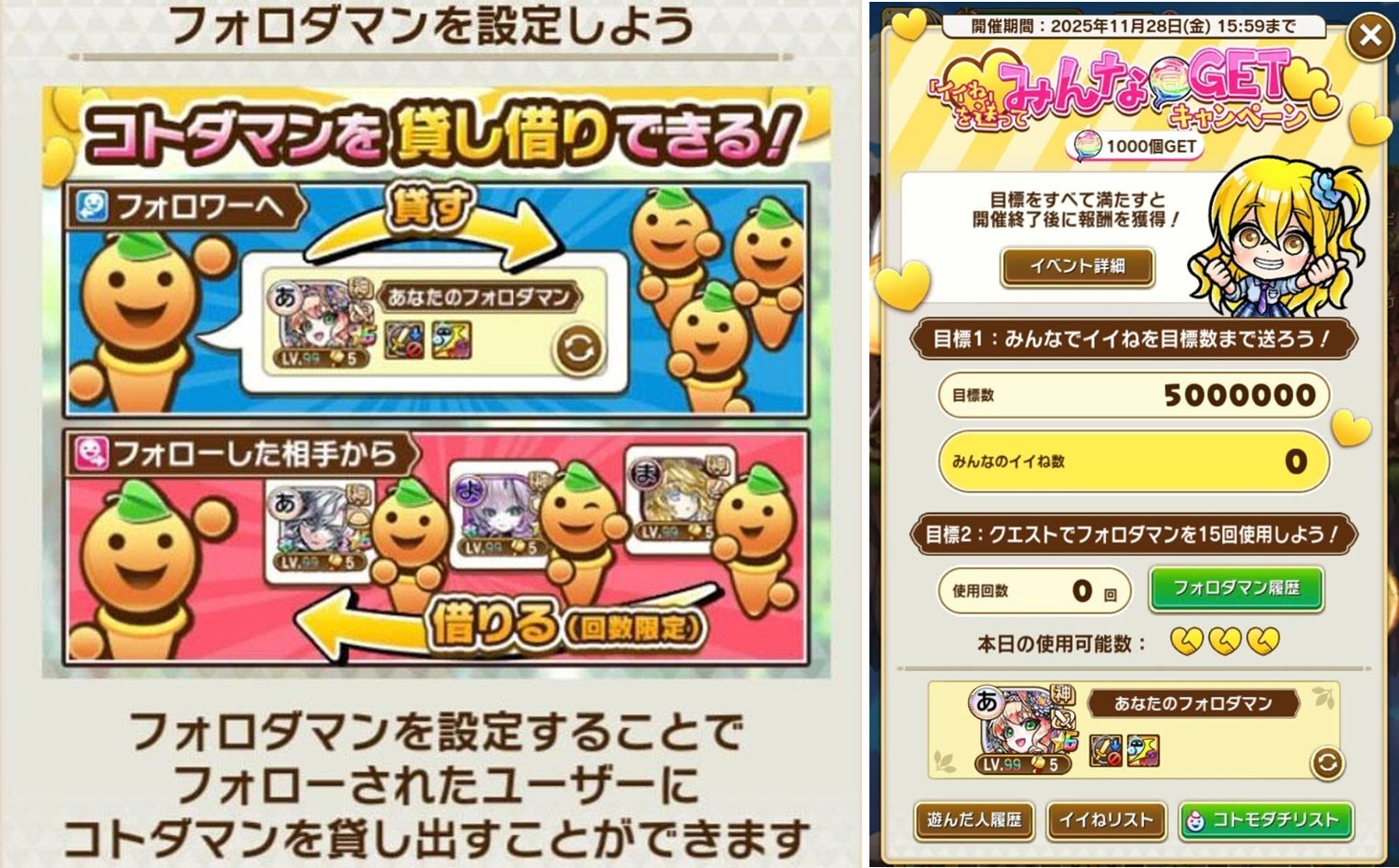 7.5周年を記念して、「「イイね!」を送ってみんな虹のコトダマGETキャンペーン」を開催します。キャンペーン期間中は「フォロダマン」機能が期間限定で登場し、フォローしたユーザーのコトダマンと一緒にクエストに挑戦することできます。クエスト終了後には「イイね!」を送ることができ、全ユーザーの「イイね!」合計数が目標を達成し、さらに自身が15回以上フォロダマンを利用すると、報酬として「虹のコトダマ」を獲得できます。