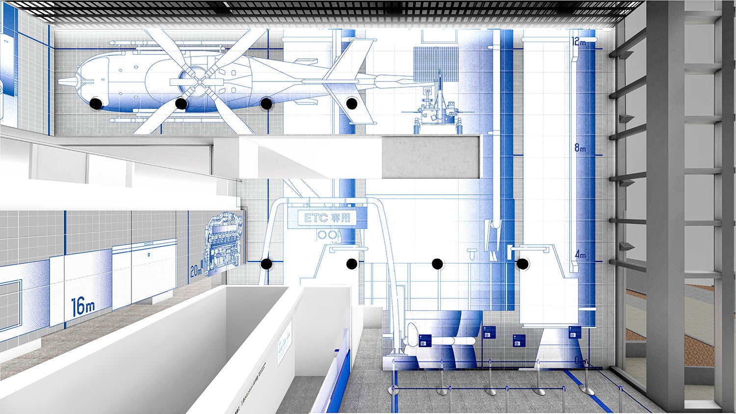 エントランスでは、高さ10m以上の大空間を利用し、三菱重工グループが手がけるロケットやガスタービン、全自動無人運転車両システム(APM)などの実物大グラフィックを壁一面に展示した「1/1 SCALE PROJECT」を通じて、来館者は多彩な製品群のスケールを実感し、三菱重工グループの幅広い事業領域や社会を支える技術への理解を深めることができます。