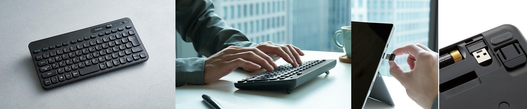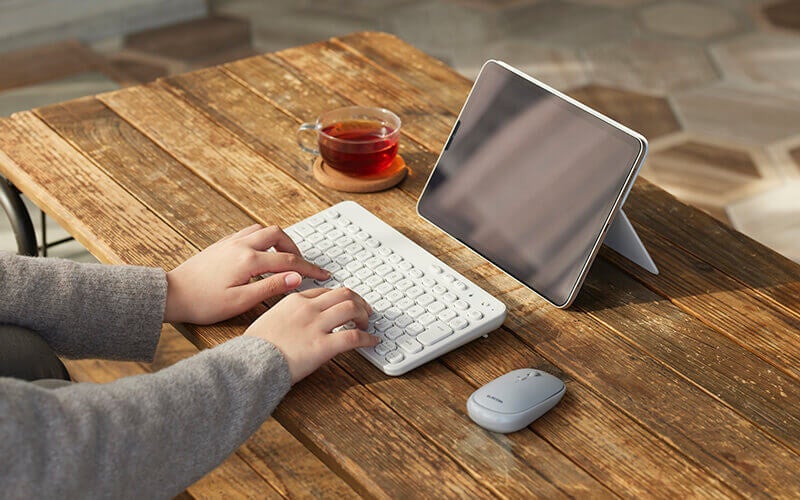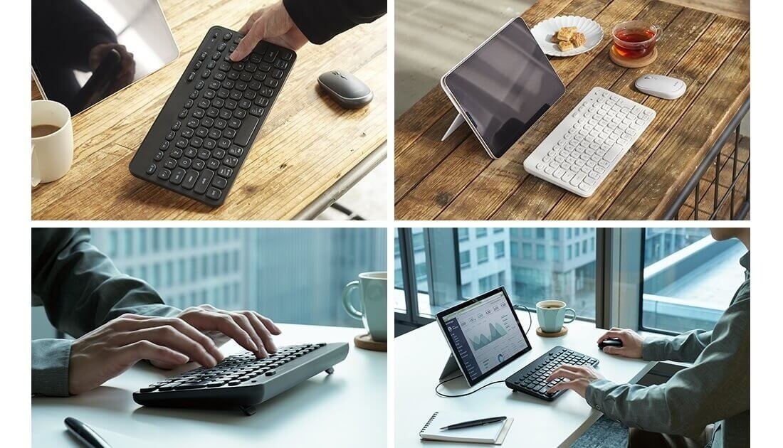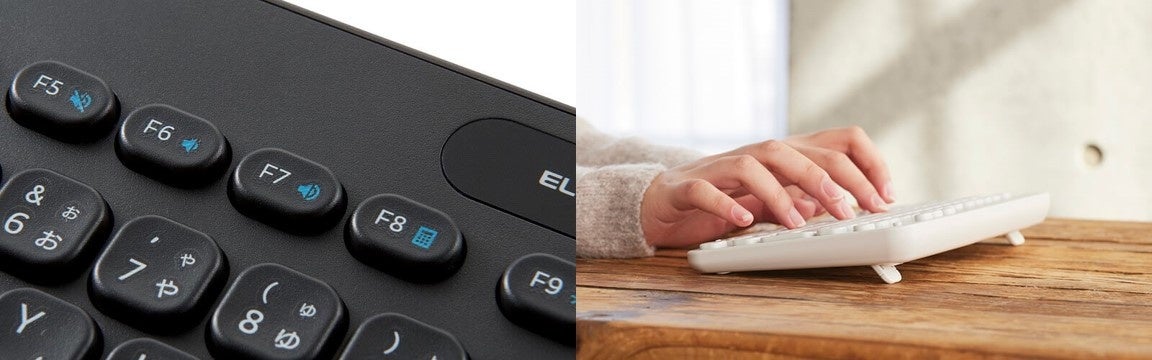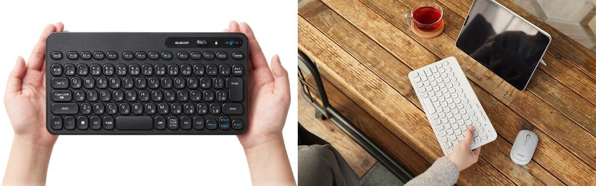 デバイス2台の接続先を保存でき、5種類のOSを自動で識別できる「Bluetooth(R)タイプ(2色)」、超小型レシーバー(USB接続)付きの「2.4GHz無線タイプ」、電池のいらないケーブル長 約1.5mの「USB有線タイプ」の3タイプから選べます。