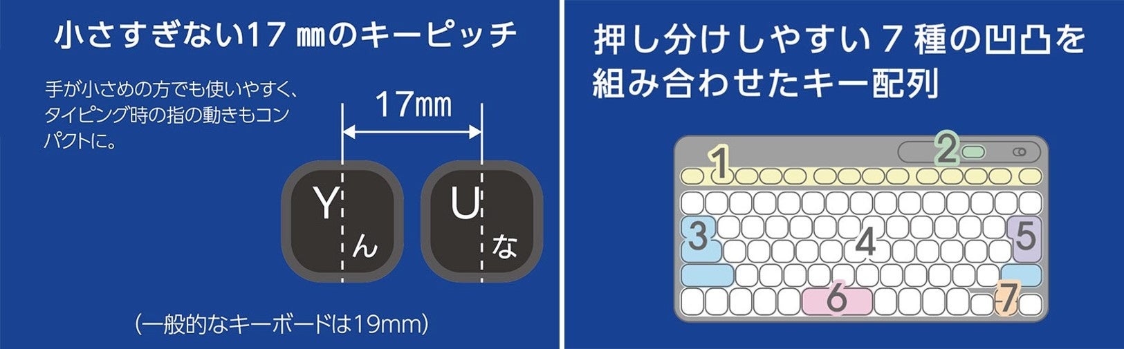 キーピッチは17mmで手の大きさを問わず打ちやすく、押し分けしやすいように7種の凹凸を組み合わせたキー形状になっています。