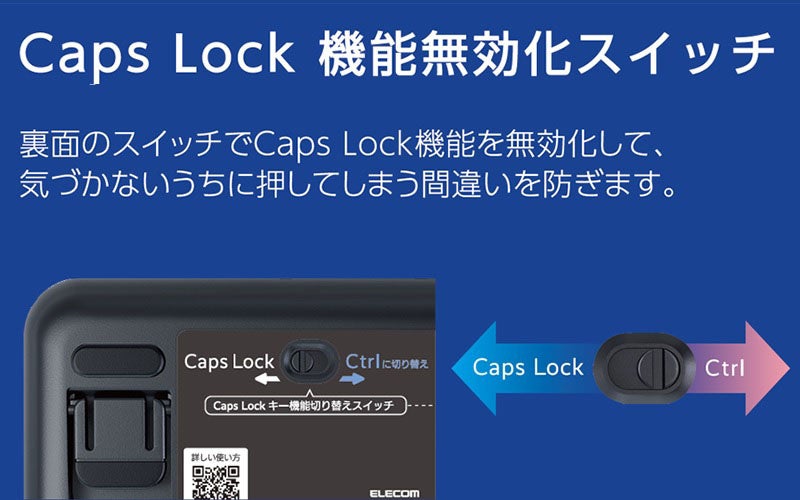 気づかないうちに押してしまいやすいCaps Lock機能をロックできる、“Caps Lock機能無効化スイッチ”を搭載しています。