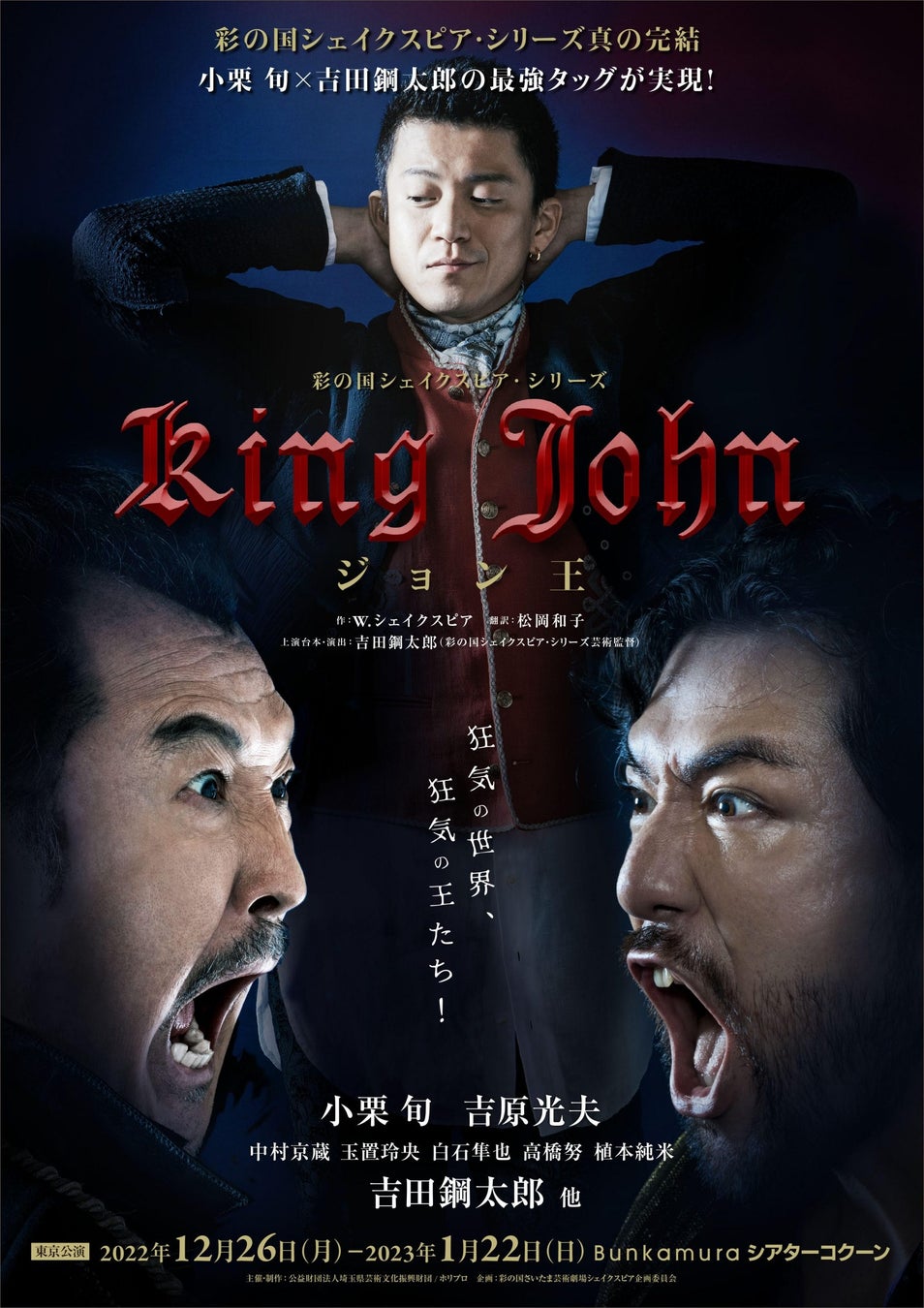 タイトルロールの“ジョン王”役には、ミュージカル界で圧倒的な実力を誇る吉原光夫。今回がシェイクスピア初挑戦となる。演出も兼ねる吉田鋼太郎は、ジョン王と敵対する“フランス王”役で出演。(※)東京公演は他都市の公演と出演者・配役が一部異なります。