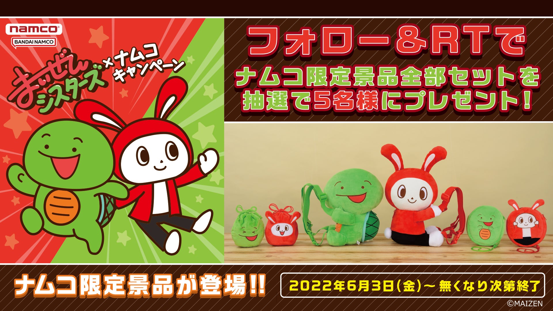 バンダイナムコアミューズメント公式Twitterアカウントをフォローして、指定のツイートをリツイートしていただいた方の中から抽選で5名さまにまいぜんシスターズナムコ限定クレーンゲーム景品を全部セットでプレゼントします。