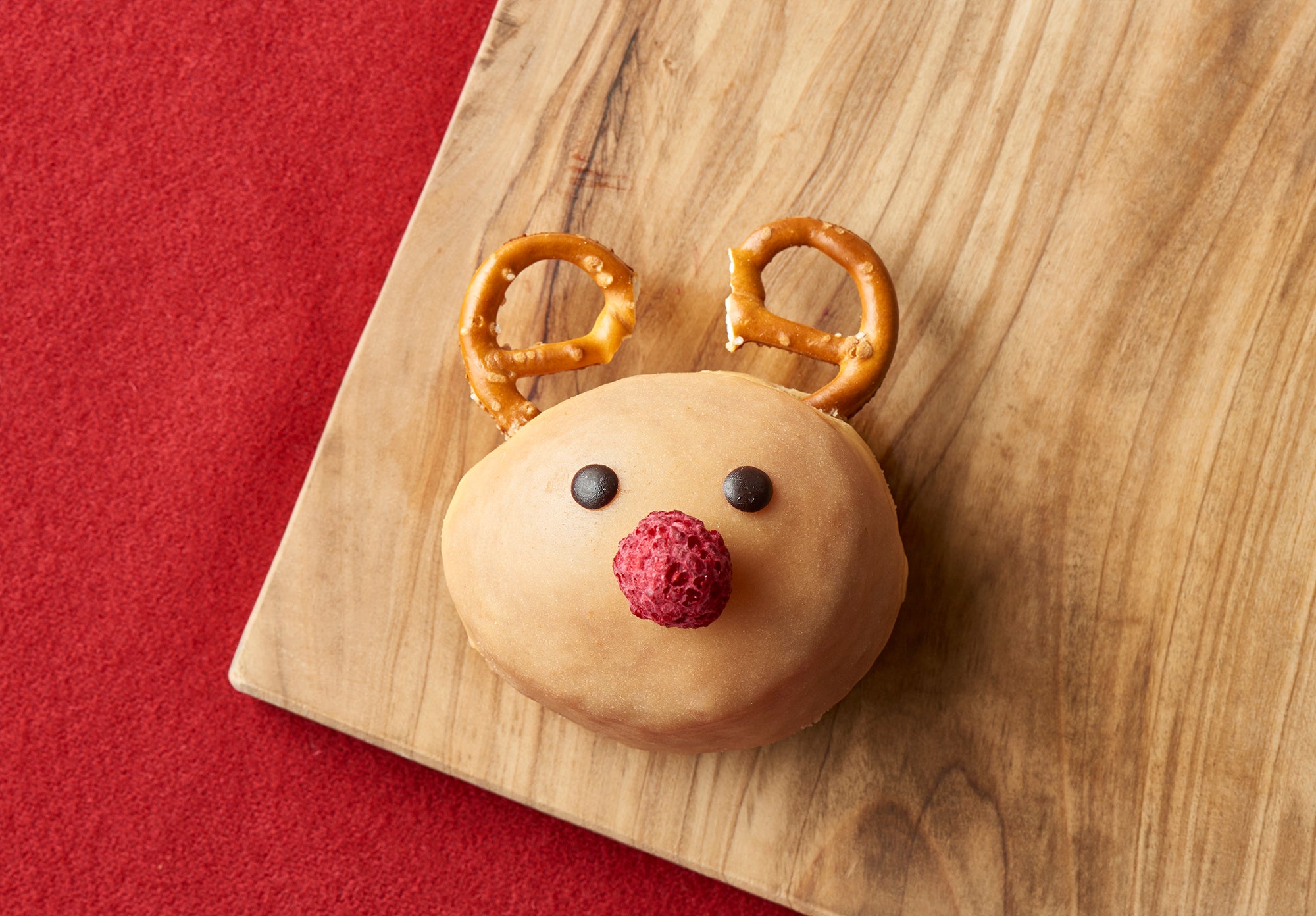 キャラメルベースのグレーズに、オーガニックプレッツェルのツノをプラスして、赤鼻には無添加のフリーズドライラズベリー。