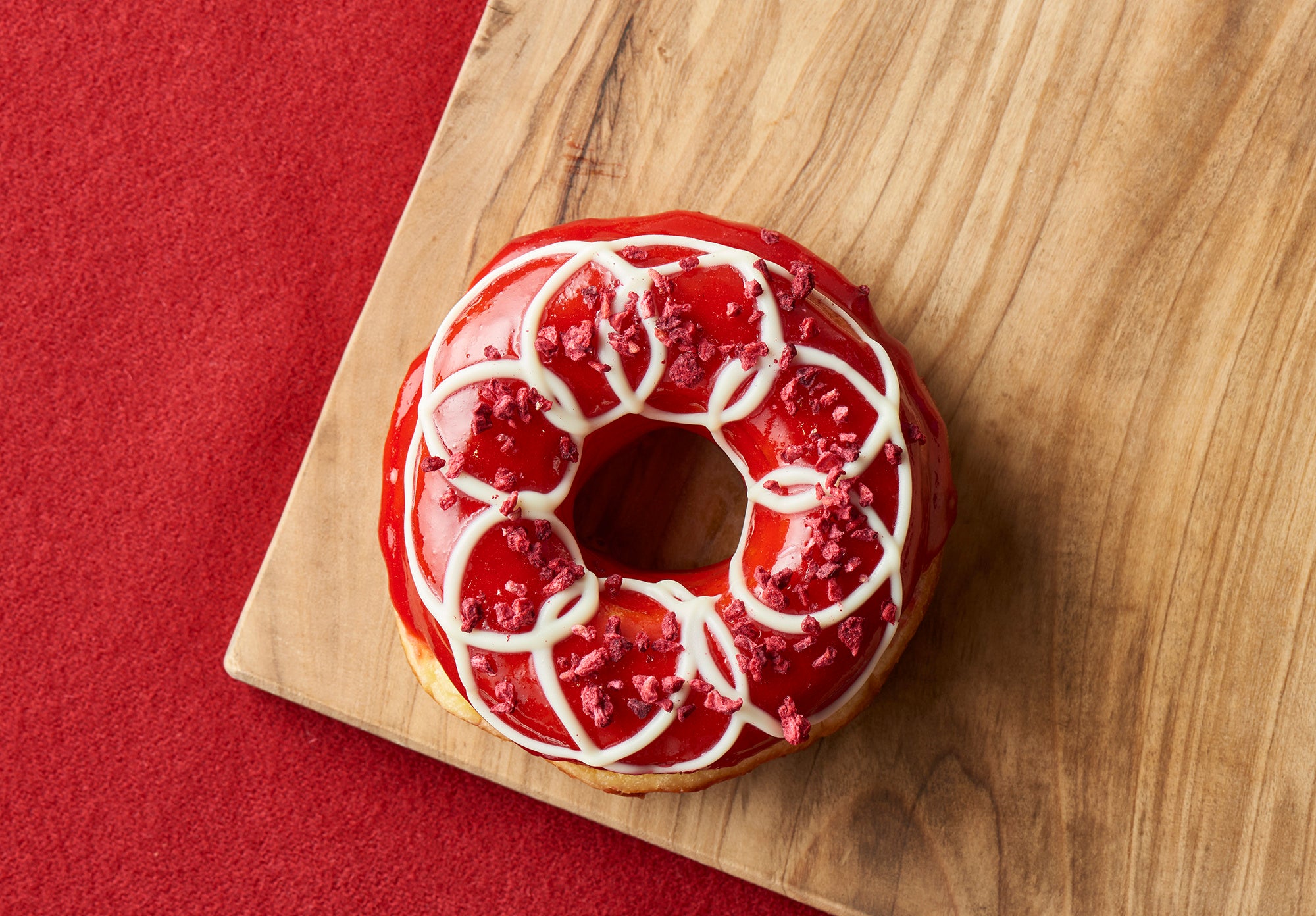 甘酸っぱい無添加ラズベリーピューレのグレーズを使用した、リースのような色鮮やかなドーナツ。