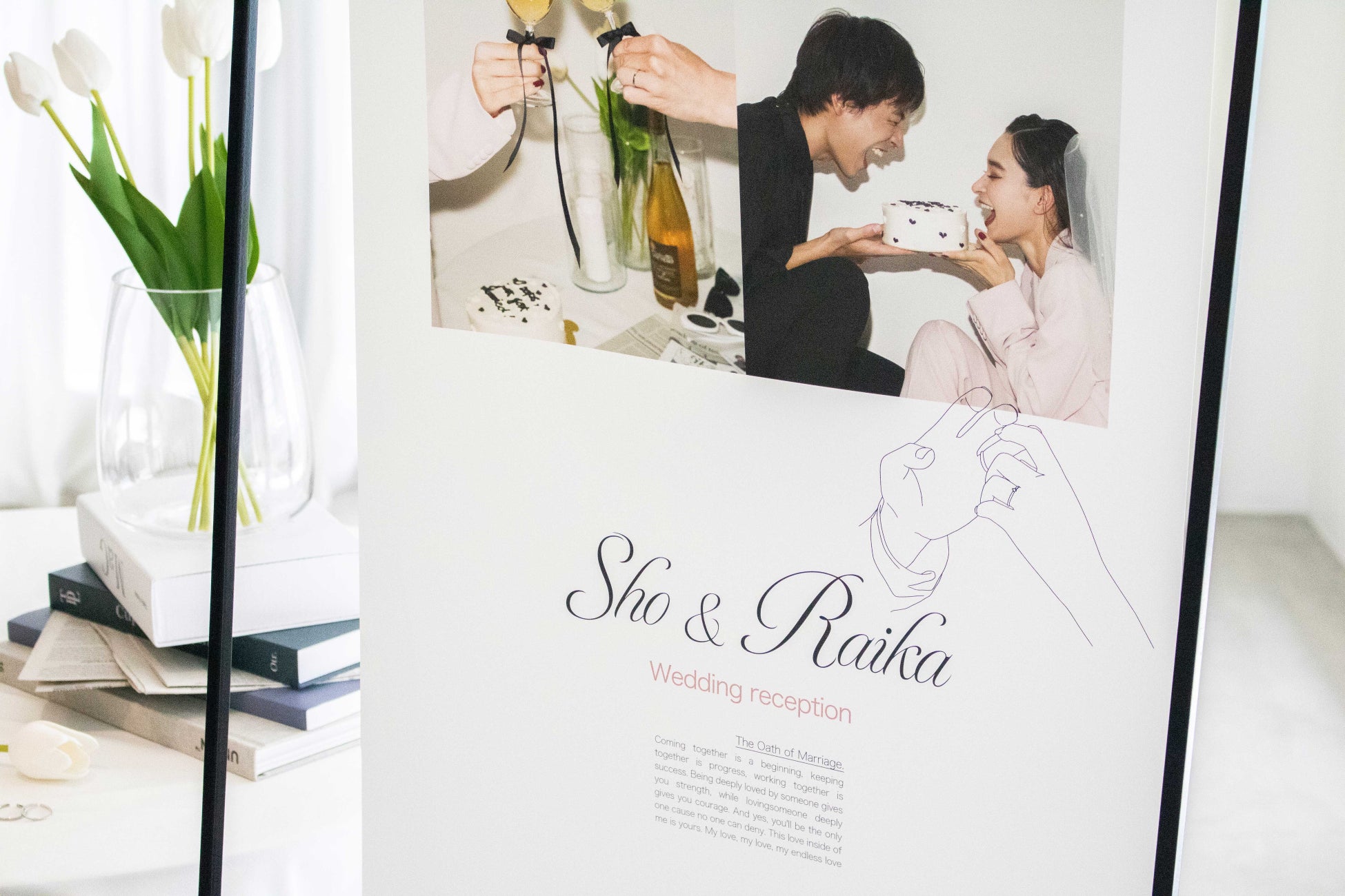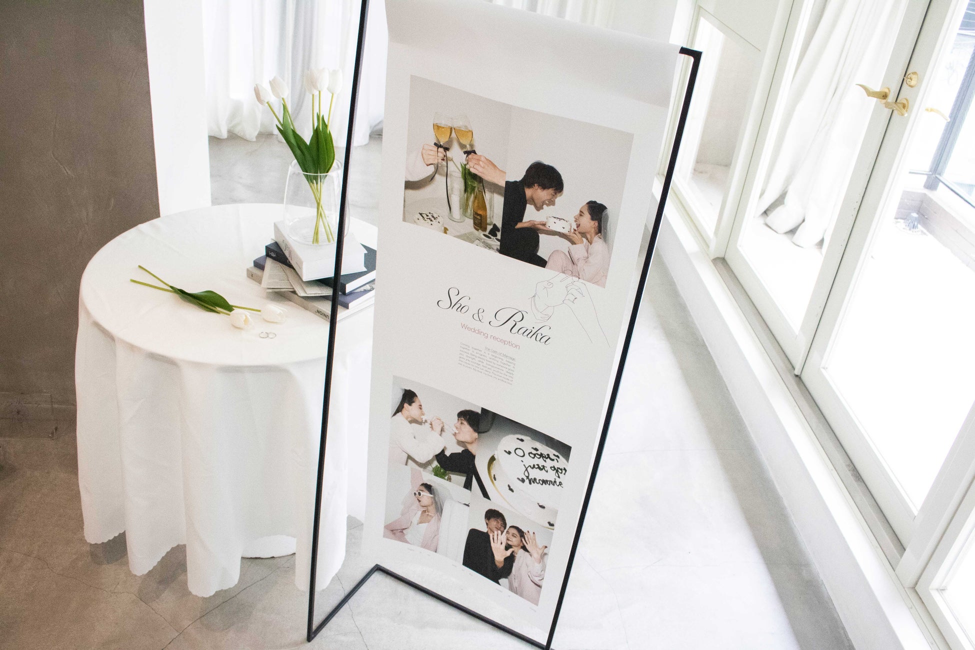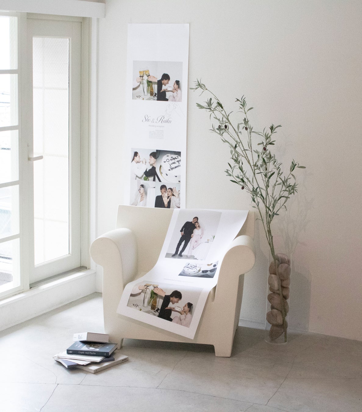 お二人のお写真をお好みのデザインに落とし込み、世界に一つだけのウェディングタペストリーをお作りいたします。挙式会場でラックから吊り下げたり、壁に貼ったり、椅子や机に垂れ下げたりなどディスプレイ方法も多数。