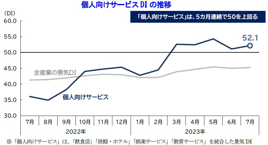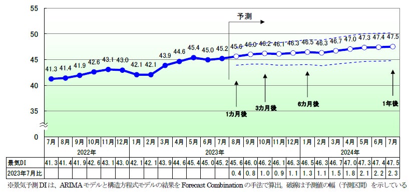 2023年7月の景気DIは前月比0.2ポイント増の45.2となり、2カ月ぶりに改善した。景気は、人出の増加や猛暑などで季節もの消費が下支えし、小幅ながらプラスに転じた。今後の国内景気は、設備投資の拡大や対面サービスをベースに緩やかな上向き傾向で推移するとみられる
