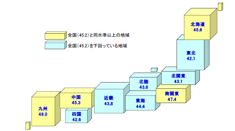 『北海道』(45.6)…前月比1.7ポイント増。6カ月連続で改善。札幌など都市部のほか、道東・日胆エリアがいずれも改善した。夏シーズンに入り観光産業が引き続き好調だったほか、飲食料品など『製造』は5カ月連続で上向いた。