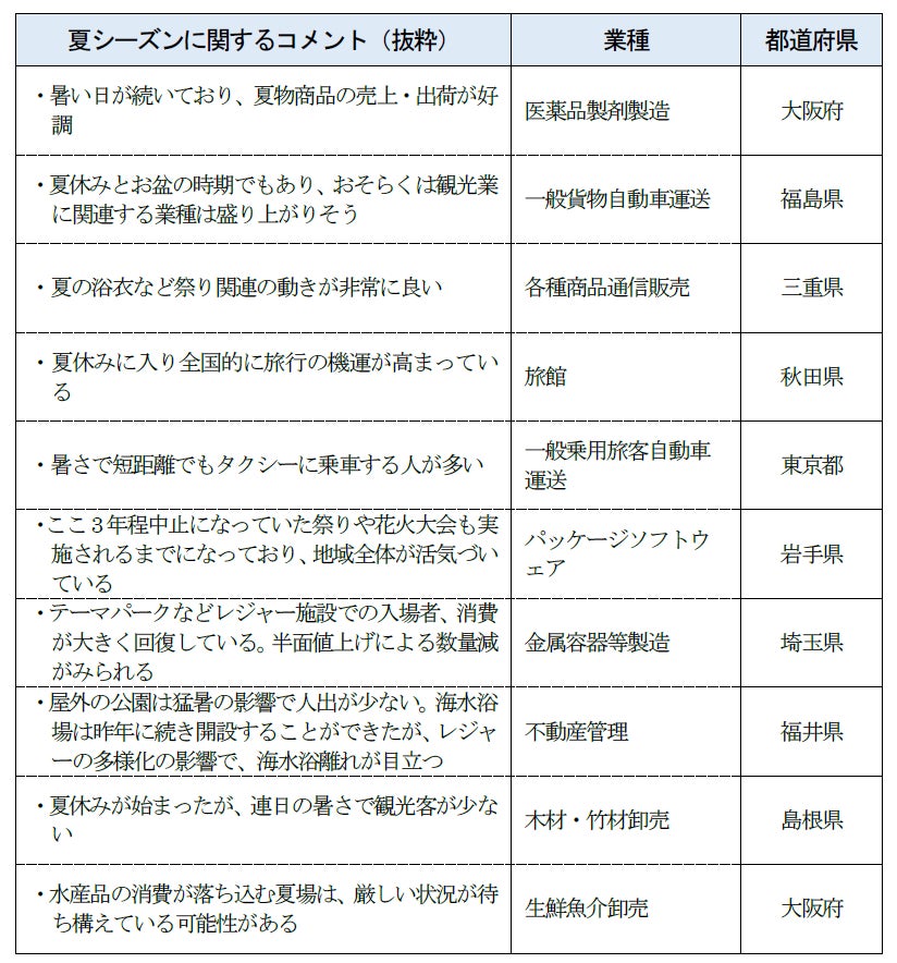 夏休みシーズンを迎え、人出の増加とともに対面サービスも回復がみられた。貸切バスやタクシー需要が活発化したほか、気温の上昇により関連商品のニーズが高まった。原材料価格の高止まりや慢性的な人手不足はあるものの10業界中6業界で改善した。