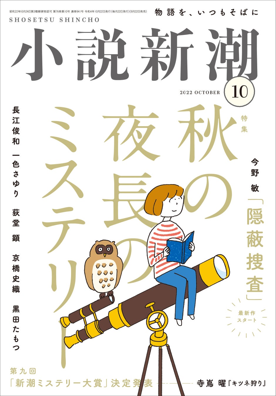 この9月に創刊75年を迎えた「小説新潮」、10月号の特集はミステリー小説です。累計300万部を超えた大人気警察小説、今野敏「隠蔽捜査」の第10弾となる新章「一夜」がスタート! 神奈川県警のキャリア刑事部長、竜崎伸也が小説家の誘拐事件に挑みます。物語の舞台となる小田原を今野氏が訪れたグラビアも掲載。物語世界がより立体的に見えてきます。