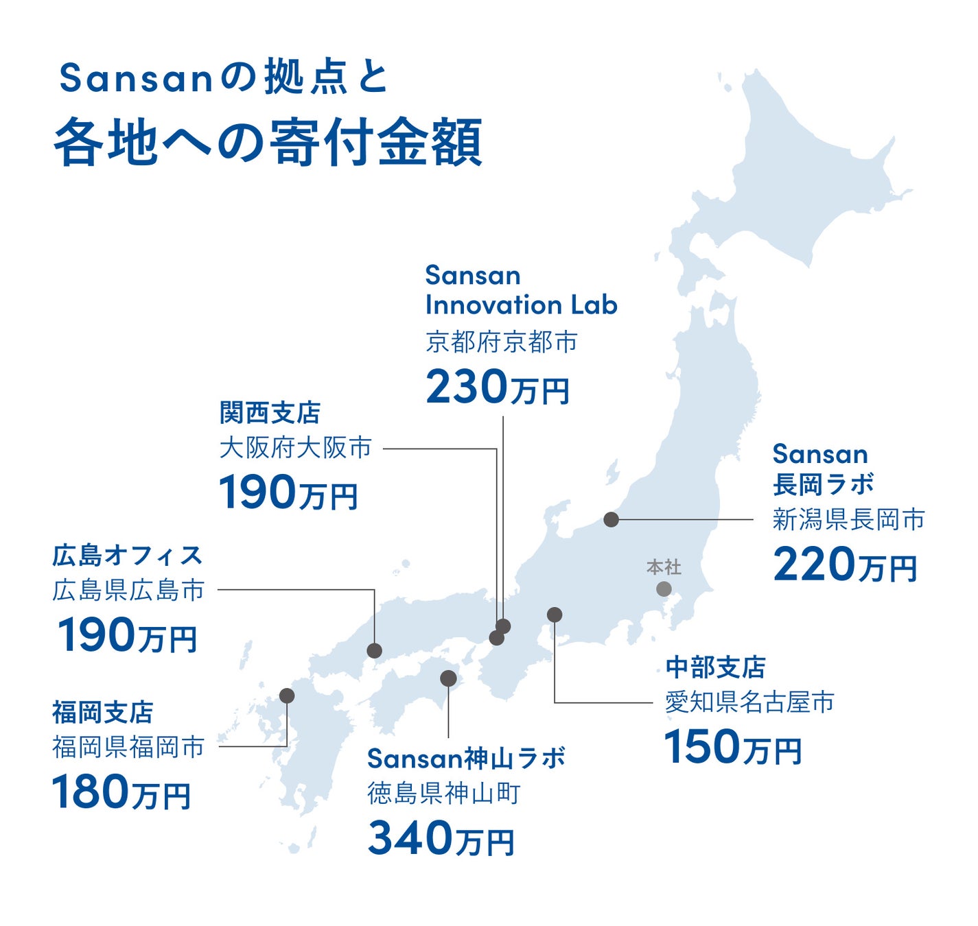 Sansanには、東京都渋谷区の本社以外にも事業活動において重要な役割を果たす7つの拠点があり、渋谷にある本社と連動して日々活動を行っています。ビジネスを通じた貢献をこれまでしてきましたが、さらに各拠点から新たな出会いと協働の機会を創出することを通じて地方創生に貢献することを目指し、当社が取り組むサステナビリティ活動「NEXT」の活動の一環として「Sansanふるさと納税プロジェクト」を立ち上げました。本プロジェクトは社員からの投票を実施し、その結果に基づいて拠点のある各地方自治体への寄付配分額を定める形式を採用しています。これにより、社員の各地域の課題や取り組みへの理解促進、拠点間の交流活性化を通した、更なる地域社会への貢献を期待しています。