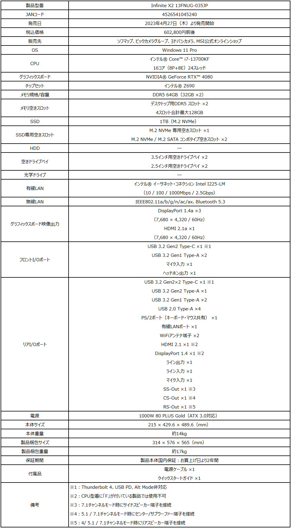 4Kゲーミング対応のハイスペックモデル第13世代インテル® Core™ i7 、GeForce RTX™ 4080搭載ゲーミングデスクトップPC「Infinite X2 13FNUG-035JP」発売