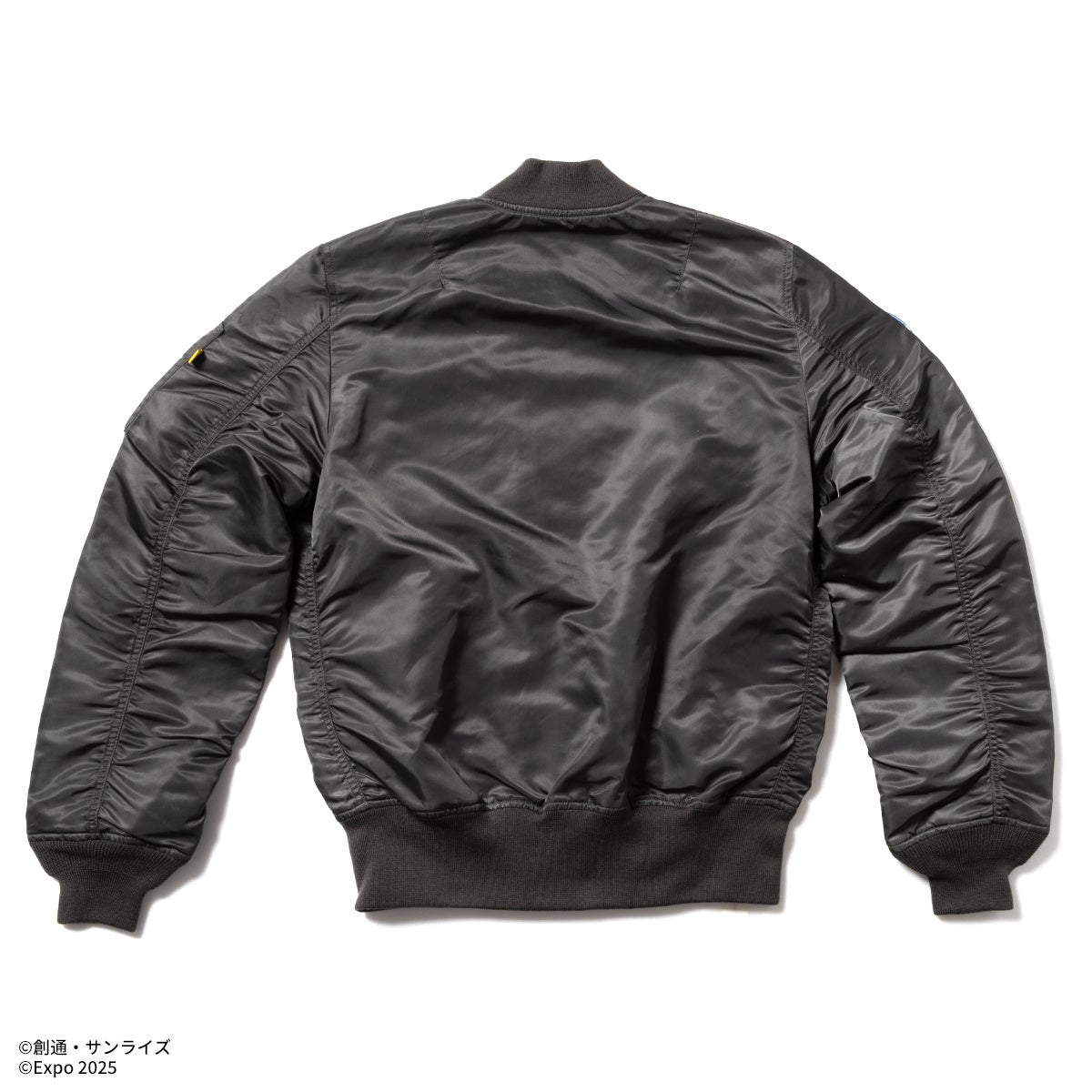 L-2ジャケットの素材はナイロンへビーツイルを採用し、カラーはガンメタルを使用。『GUNDAM NEXT FUTURE PAVILION』内で体験できる映像世界に登場する「RX-78F00/E ガンダム グラスフェザー装備」をモチーフとして使用したパッチがミリタリー感を演出しております。裏面内側には屋外に展示する実物大ガンダム像をモチーフとして使用したデザイン。全体的にすっきりしたシルエットになっており程よくツヤを抑えた上品な素材感と、薄手で羽織りやすいライトな着心地は、幅広いシーズンで活躍します。