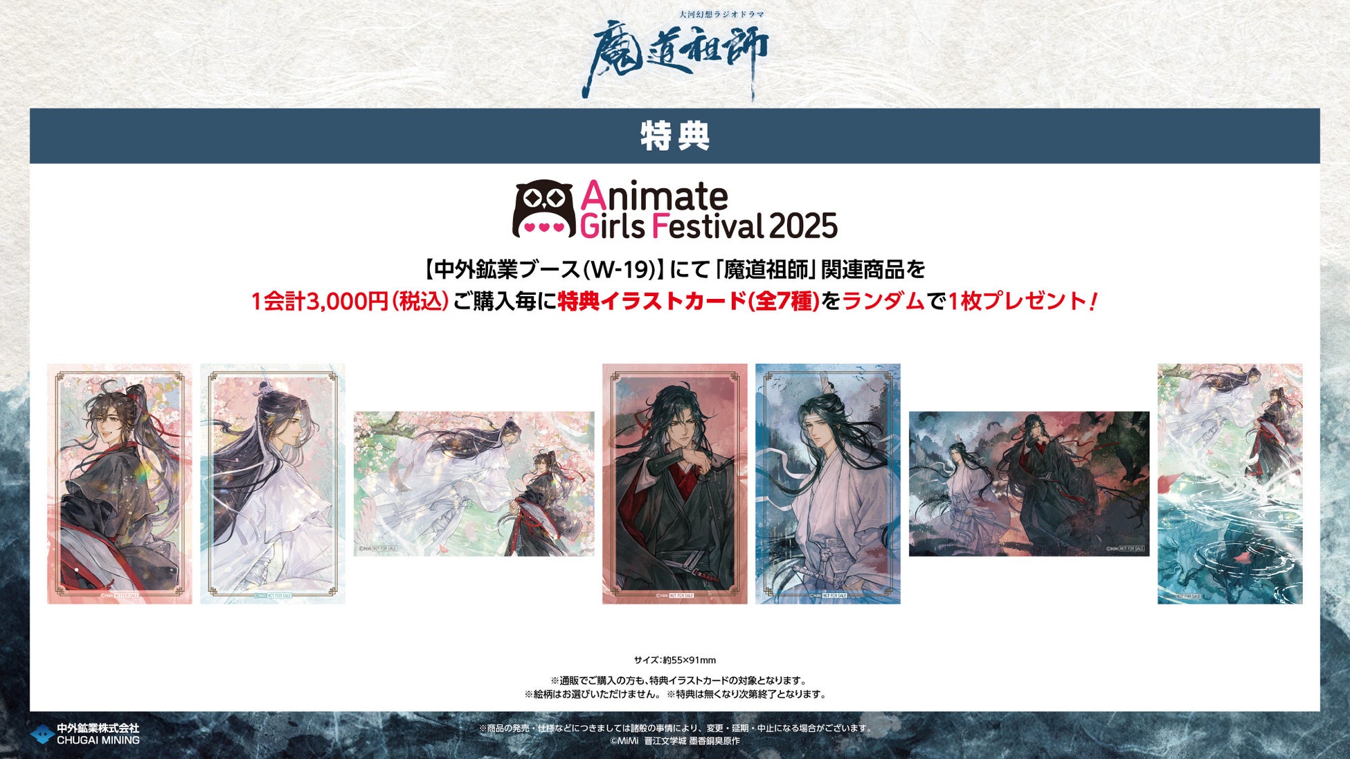 中外鉱業ブースにて『魔道祖師』AGF関連商品を1会計3,000円(税込)ご購入毎に、特典イラストカード(全7種)をランダムで1枚お渡しいたします!