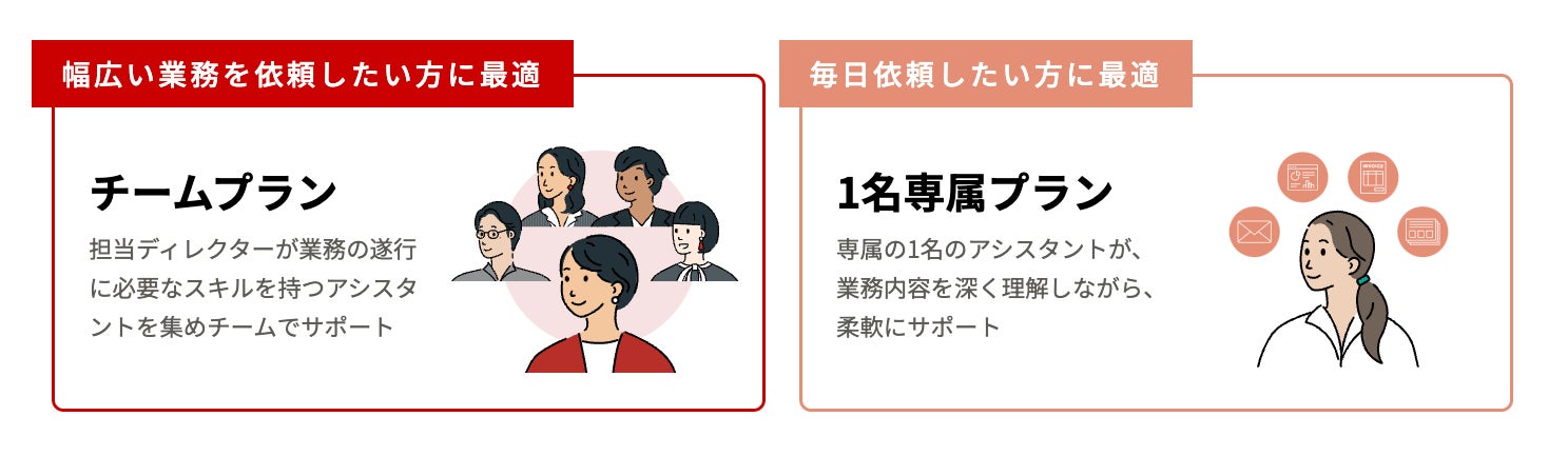 専属の1名のアシスタントが、業務内容を深く理解しながら、柔軟にサポートいたします。毎日同じスタッフが専任サポートするため、業務にばらつきなく、柔軟なサポートが可能です。
