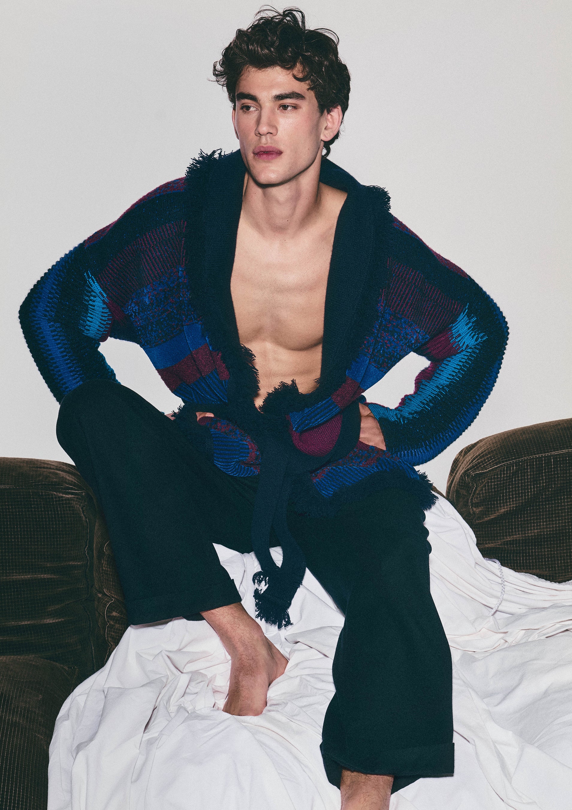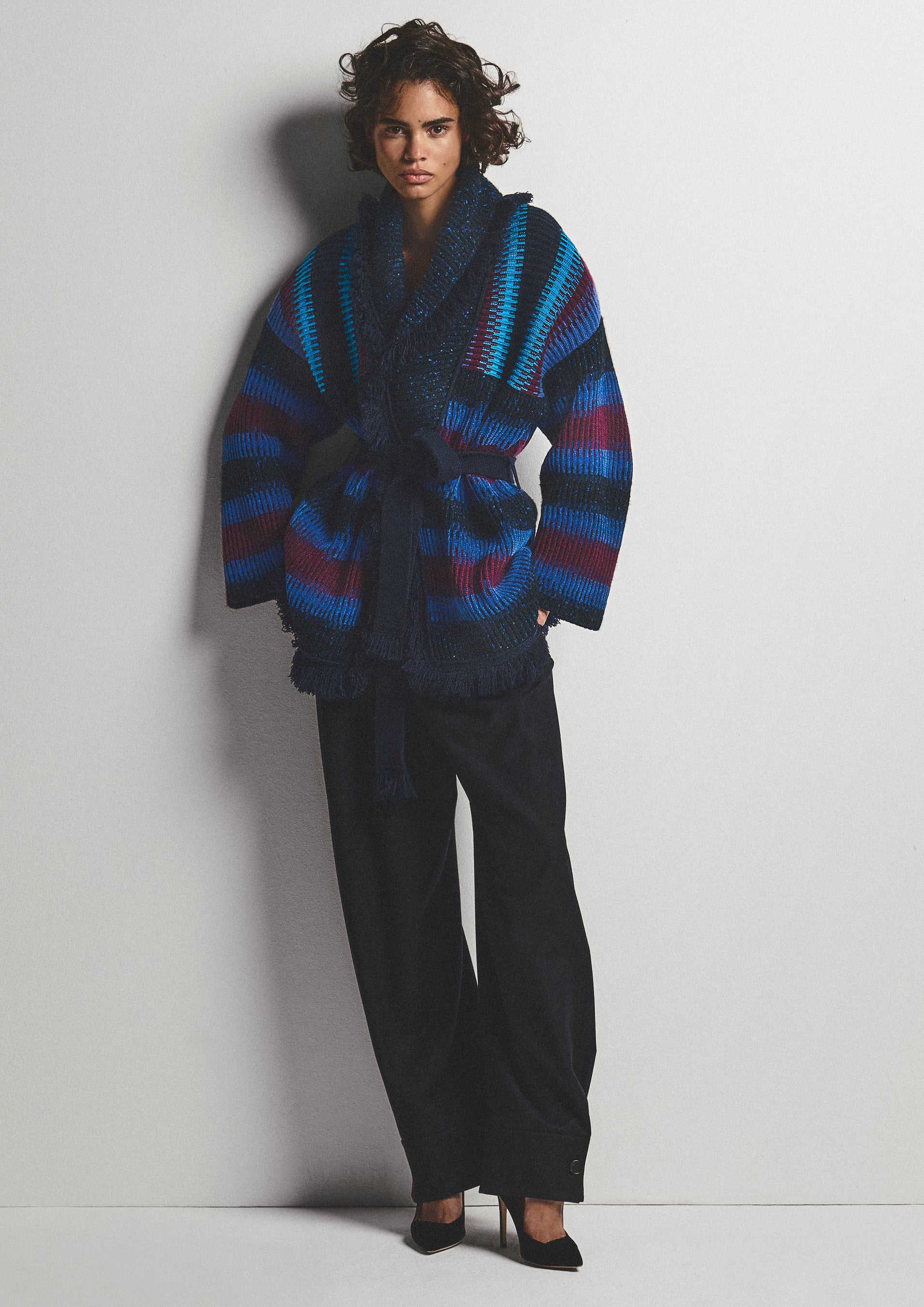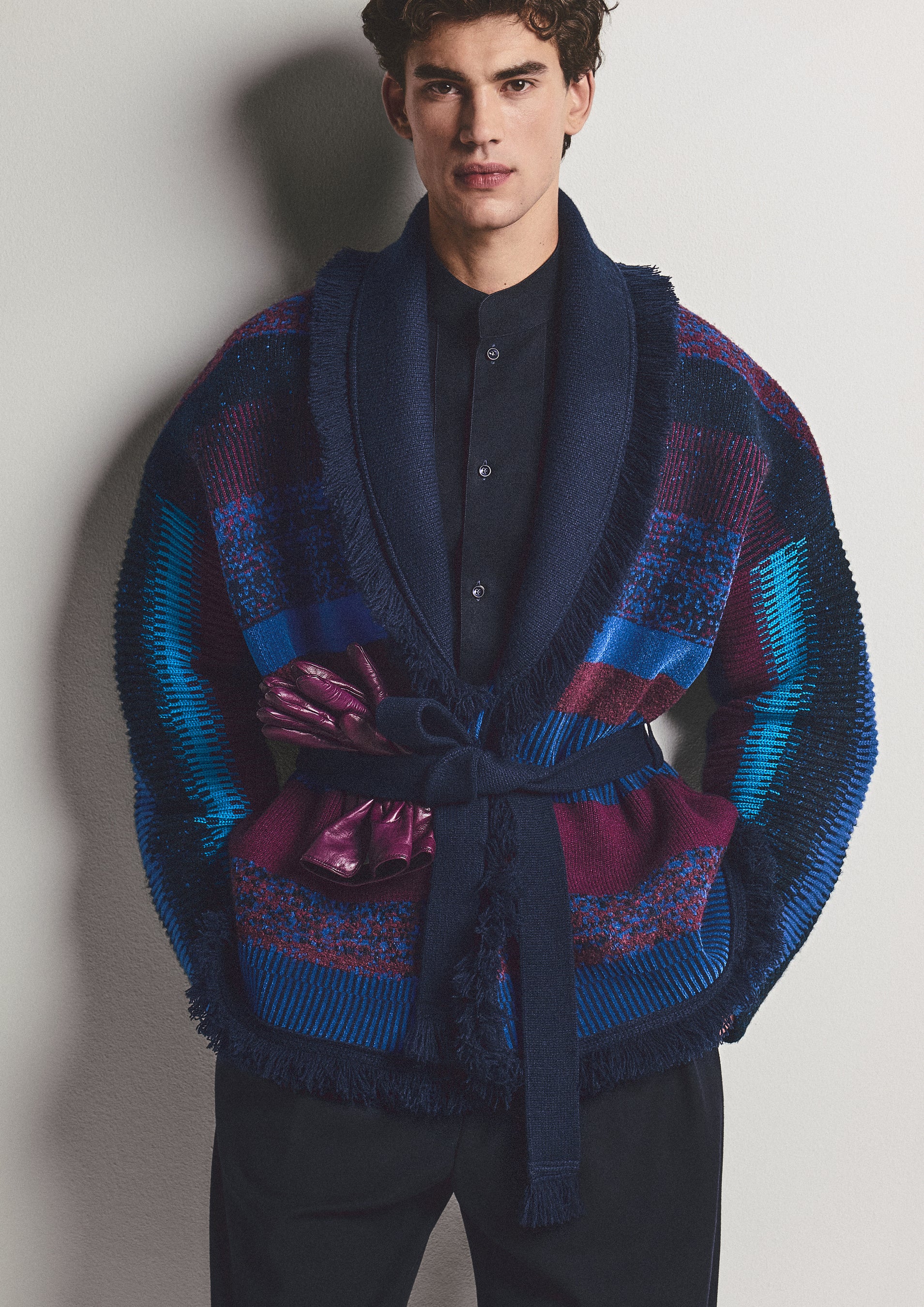 「長い旅路」を想起させるハワイ語に由来するAlanuiのスピリットは、ショールカラーに短く密度の高いフリンジをあしらい、ノットタイベルトで留めるスタイルのカーディガンに表現されています。そのシグネチャーアイテムは、アルマーニのレンズを通して再解釈され、ブルー、ライトブルー、アメシストの色調で描かれた、リズミカルなストライプによる抽象的なジャカードモチーフが特徴です。
