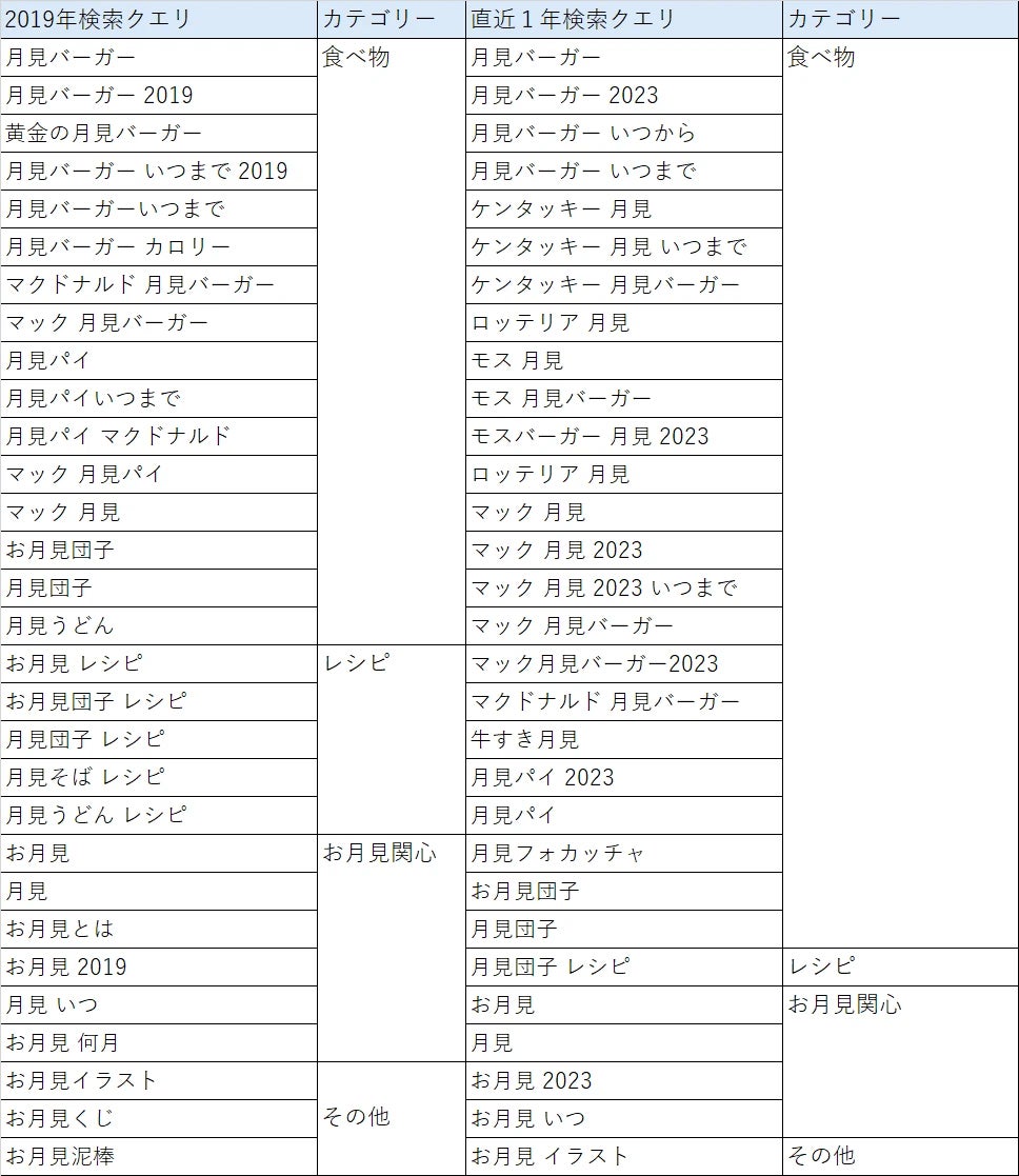 「ヤフー・データソリューション」が提供する分析ツール「DS.INSIGHT」を使用し、2019年と直近1年間(2023年7月24日~2024年7月28日)に検索された「月見」を含むキーワードを分析した結果、食べ物に関するキーワードが圧倒的に多いことが明らかになりました。特に象徴的なキーワードとして、さまざまなハンバーガーチェーンなどで販売されている「月見バーガー」が挙げられます。「お月見 楽しみ方」「お月見 準備」などの伝統的な過ごし方に関するキーワードはランキング圏外にも確認することができませんでした。このことから、“食”を通じた「お月見」の新たな楽しみ方が盛り上がっていることがうかがえます。