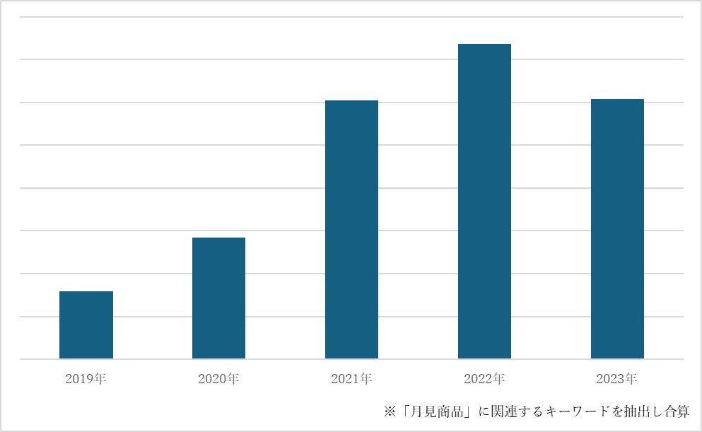 「月見」を含むキーワード群から商品と思われるもののみを抜き出し、合算して検索推移を調べたところ、2019年から2022年にかけて月見関連商品の検索ボリュームは大幅に増加し、特に2022年は2019年の約4.4倍もの検索ボリュームとなりました。SNSの普及や企業のマーケティング活動の強化なども背景に、この期間中に市場が急成長したことが考えられます。