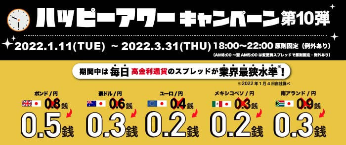 本キャンペーンは、毎日(月曜日~金曜日)18:00~22:00の時間限定で、ポンド/円、豪ドル/円、ユーロ/円、メキシコペソ/円、南アフリカランド/円の計5通貨ペアのスプレッドを大幅縮小するものです。