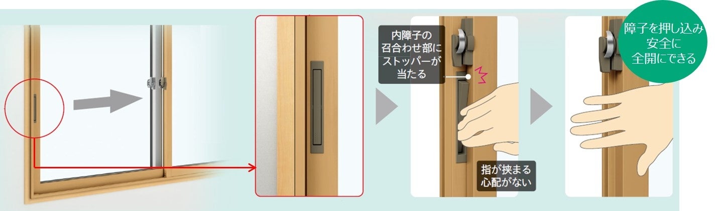 内窓を設置した場合、外窓の施錠をする際、外窓のクレセントを操作するために、内窓の外障子(内観左側の障子)を全開にする必要があります。その際、従来品の引手では指を挟む危険があったため、『ストッパー付安全引手』(日本特許出願中)を開発し、標準採用しました。「ウチリモ 内窓」の外障子を内障子側に引き込む際、引手に指をかけるとストッパーが飛び出し、その状態で障子を開けると指を挟む手前でストッパーが内障子にぶつかりストップ。引手から指を離すとストッパーが戻り、その後全開状態にすることで指はさみを防止する新しい引手です。