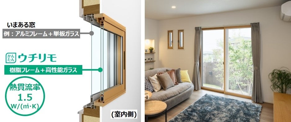 こうした課題を解決するために、引違い窓の見込みを薄くし、さらに枠を室内側に持ち出す『枠持ち出し納まり』により、窓額縁の取り付け寸法が最小47mm(※1)あればふかし枠が無くても取り付け可能な新しい内窓「ウチリモ 内窓」を発売します。 “かんたん”な施工性はもちろんのこと、ふかし枠と補強材を使わないことで意匠性が向上し、費用も抑えることができる商品です。窓の断熱性能も向上させ、Low-E複層ガラスのアルゴンガス無しの仕様で熱貫流率Uw値1.5 W/㎡・K(※2)以下を実現し、「先進的窓リノベ事業」の内窓設置における“Sグレード(※3)”の対象製品として登録される予定です。今回、新商品発売とともにシリーズ名を「マドリモ 内窓 プラマードU」から「ウチリモ 内窓」に変更します。内開き窓やFIX窓など従来品もシリーズ名を変更し「ウチリモ プラマードU」として販売を継続します。