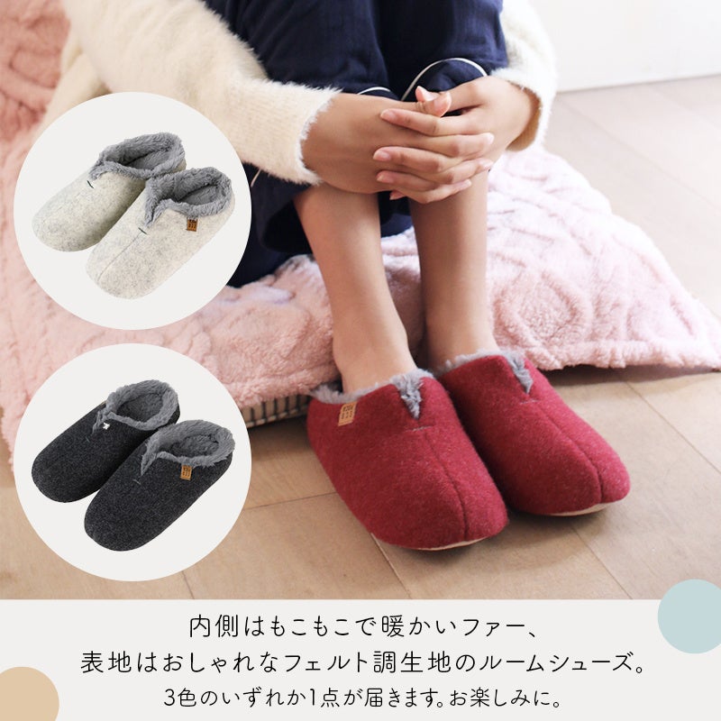 内側はもこもこで暖かいファー、表地はおしゃれなフェルト調生地で仕上げています。踏み心地がいい底圧と柔らかさ、足全体を包み込むような毛足の長いファーは床冷えを軽減します。