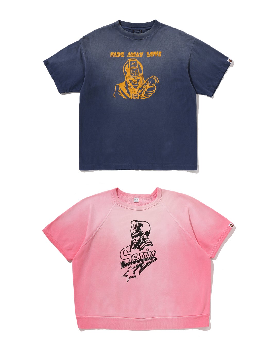 Tシャツは、フロントに猿のスカル、バックに「SAINT SHALL ALWAYS LOVE APE」をプリントしたブラックと、フロントに©SAINT Mxxxxxxがアレンジした“GENERAL HEAD”と「FADE AWAY LOVE」をプリントしたネイビーの2型を展開。それぞれ象徴的なメッセージを大胆に配したデザインが特徴です。